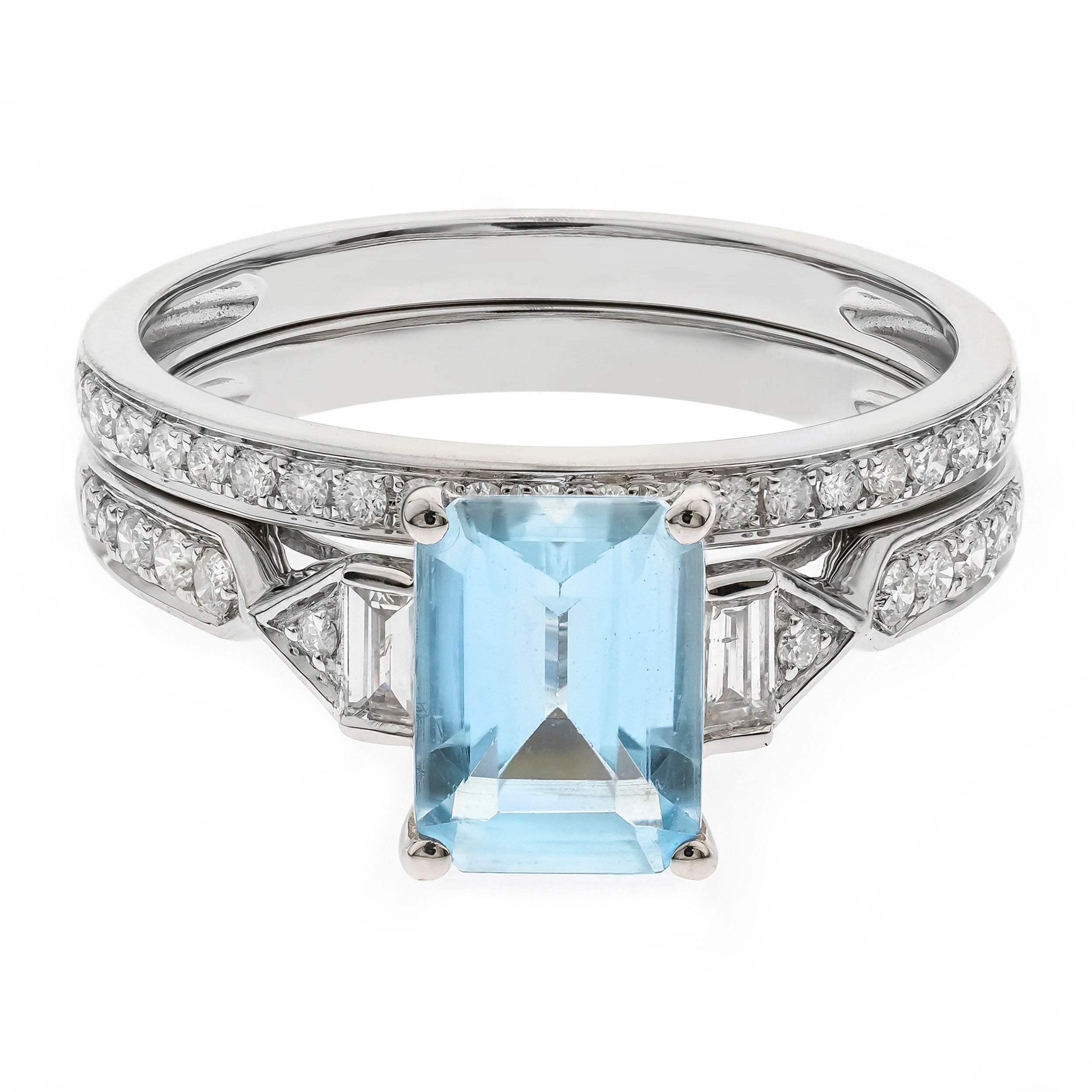 Stunning, timeless and classy eternity Engagement ring. Decorate yourself in luxury with this Gin & Grace ring. This ring is made up of 6X8 Emerald-Cut Prong Setting Genuine Brazilian Aquamarine (3 pcs) 1.32 Carat and Round-Cut Prong Setting Diamond (34 pcs) 0.26 Carat accent stones for a lovely design. This ring is weight 3.30 grams. The ring is crafted of shining 14-karat White Gold and is completed by a highly polished finish.