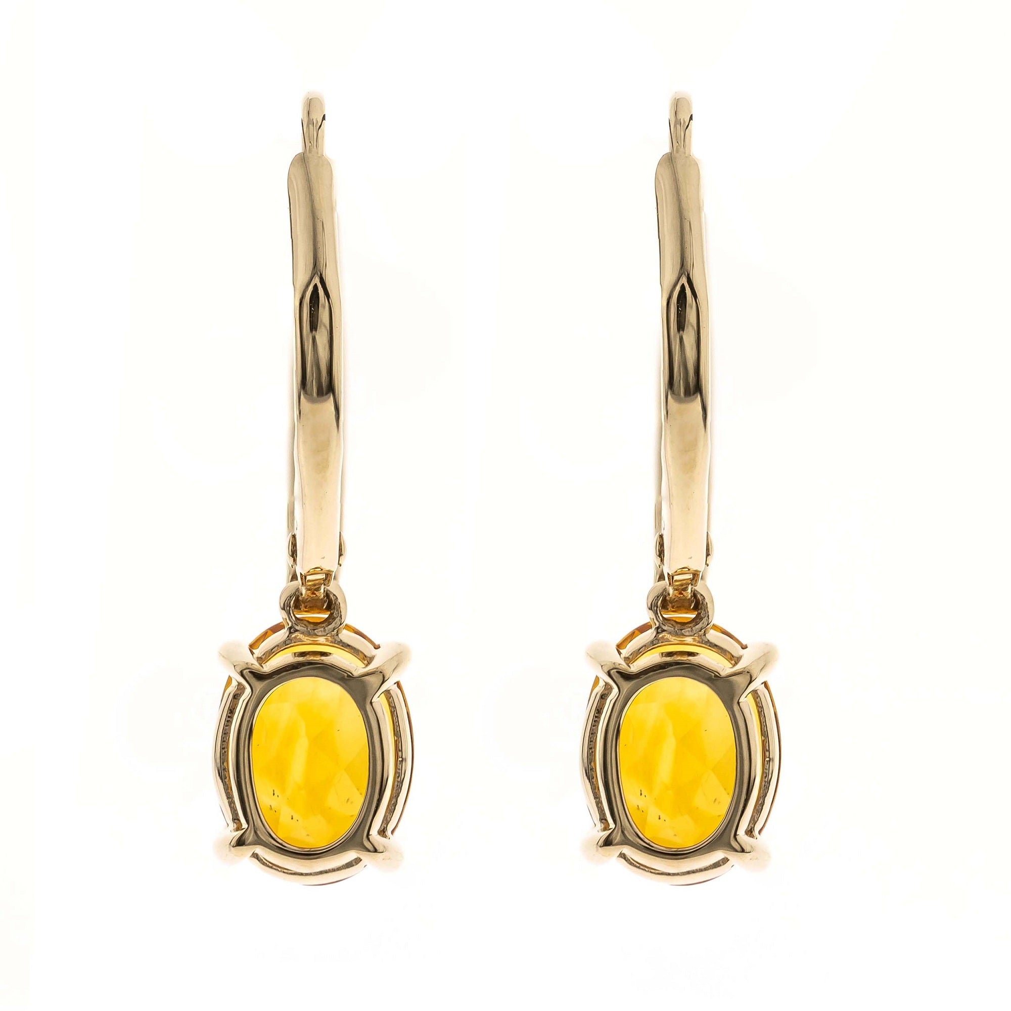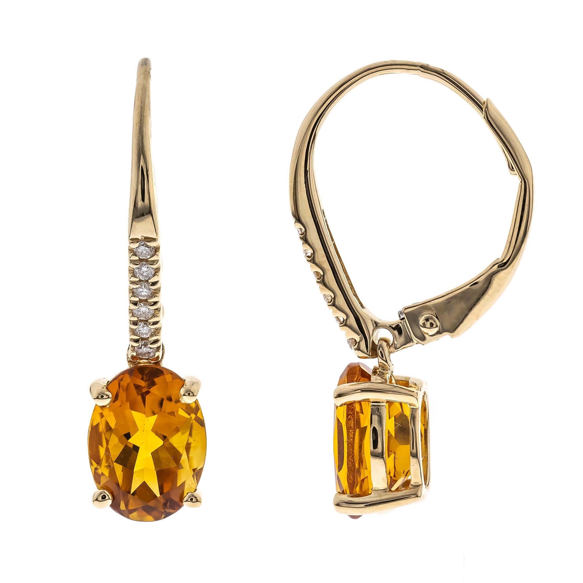 Decorate yourself in elegance with this Earring is crafted from 14K Yellow Gold by Gin & Grace Earring. This Earring is made up of Oval-Cut prong setting Brazilian Citrine (2 pcs) 2.36 Carat and Round-Cut prong setting Diamond (12 pcs) 0.06 Carat. This Earring is weight 1.53 grams. This delicate Earring is polished to a high finish shine. Simple lever back clasps keep these earrings securely fastened.