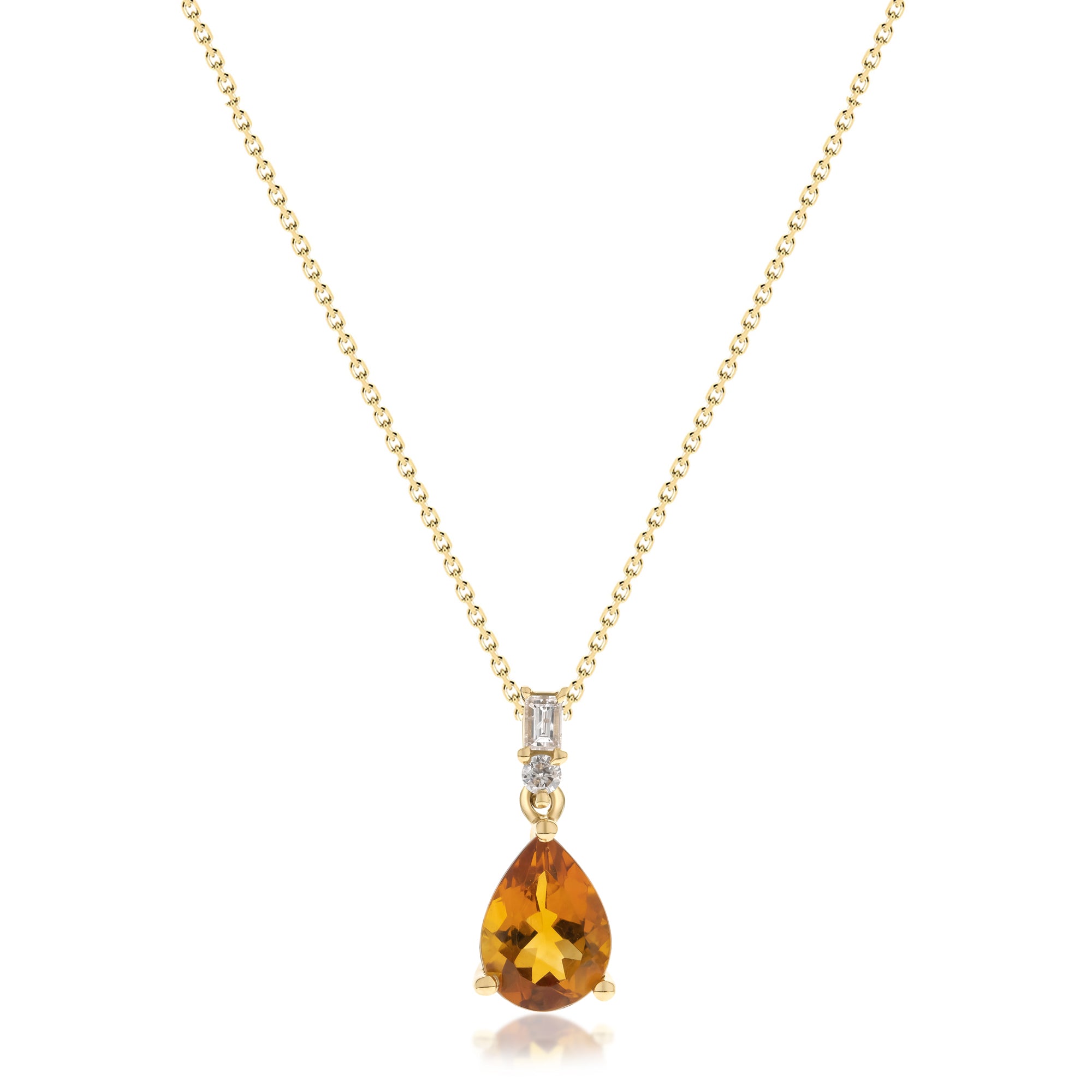 Decorate yourself in elegance with this Pendant is crafted from 10-karat Yellow Gold by Gin & Grace. This Pendant is made up of Pear-cut Brazilian Citrine (1 pcs) 1.07 carat and Round-cut White Diamond (2 Pcs) 0.07 Carat. This Pendant is weight 0.54 grams. This delicate Pendant is polished to a high finish shine.