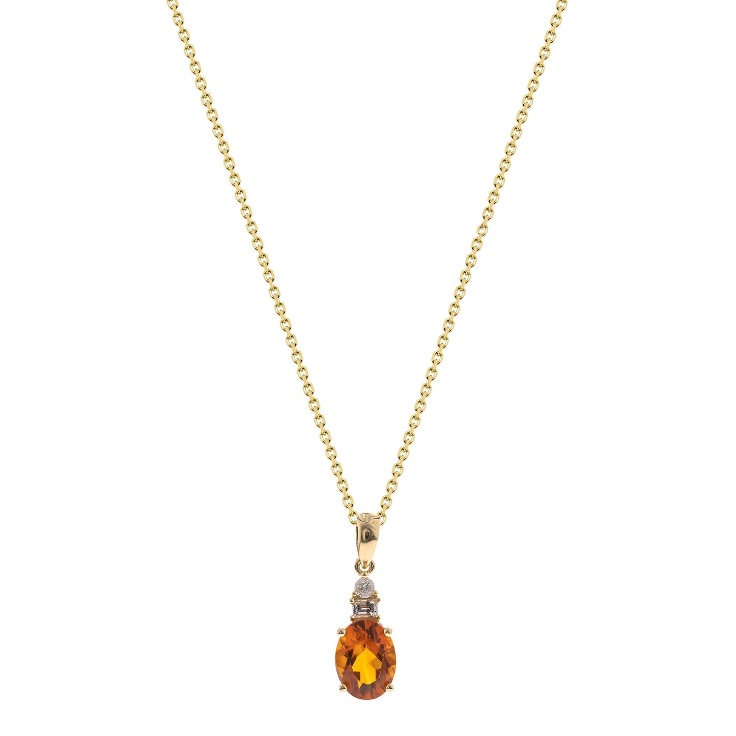 Decorate yourself in elegance with this Pendant is crafted from 10-karat Yellow Gold by Gin & Grace Pendant. This Pendant is made up of Oval-Cut Prong setting Brazilian Citrine (1 Pcs) 1.20 Carat and Baguette-Cut Prong setting White Diamond (1 Pcs) 0.04 Carat, Round-Cut Prong setting White Diamond (1 Pcs) 0.03 Carat. This Pendant is weight 0.68 grams. The gorgeous Pendant hangs from an 18-inch wheat chain. This delicate Pendant is polished to a high finish shine.