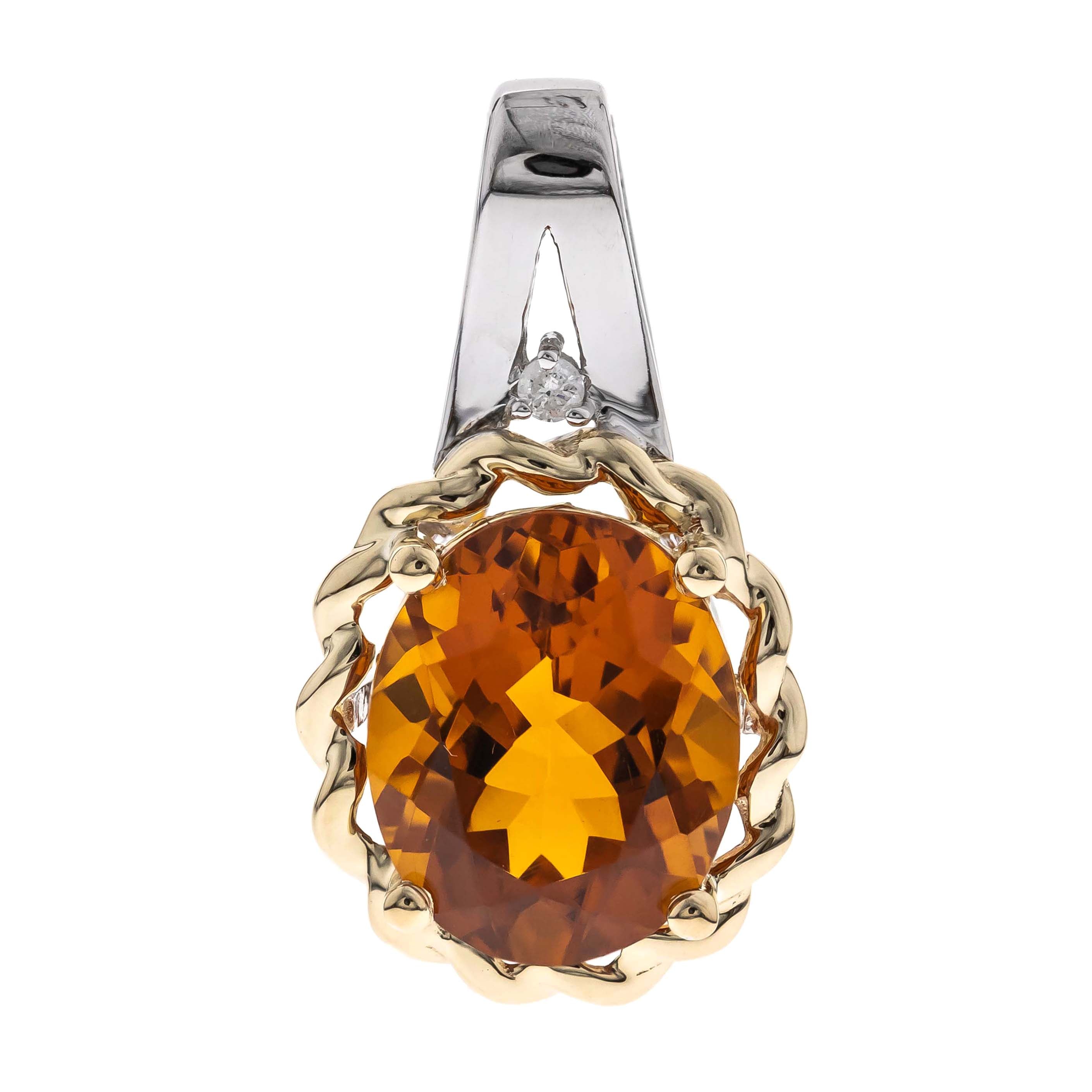 Decorate yourself in elegance with this Pendant is crafted from 10-karat Yellow Gold and Silver by Gin & Grace. This Pendant is made up of Oval-Cut Brazilian Citrine (1 pcs) 2.66 carat and round-cut White Diamond (1 Pcs) 0.01 Carat. This Pendant weighs 1.30 grams. This delicate Pendant is polished to a high finish shine.