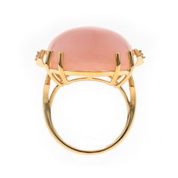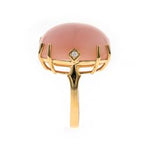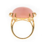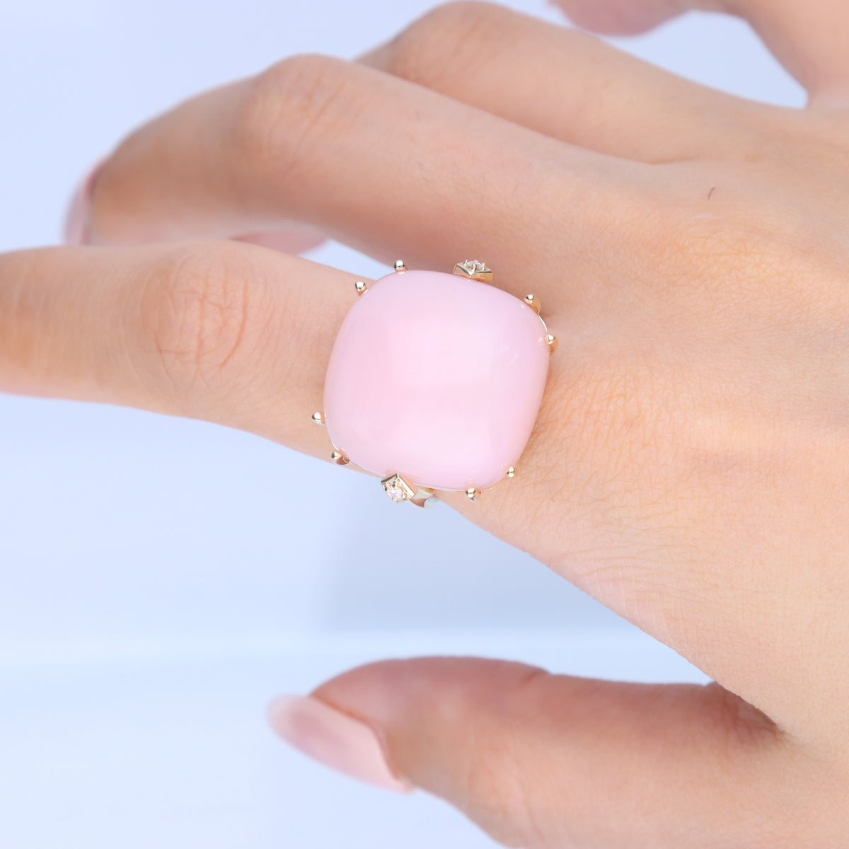 Decorate yourself in elegance with this Ring is crafted from 14K Yellow Gold by Gin & Grace. This Ring is made up of Cushion-Cab (1 pcs) 21.57 carat Peruvian Pink Opal and Round-cut White Diamond (2 pcs) 0.03 carat. This Ring is weight 3.09 grams. This delicate Ring is polished to a high finish shine.