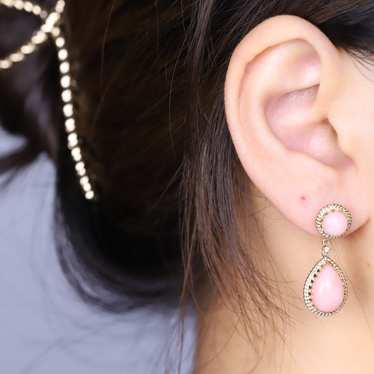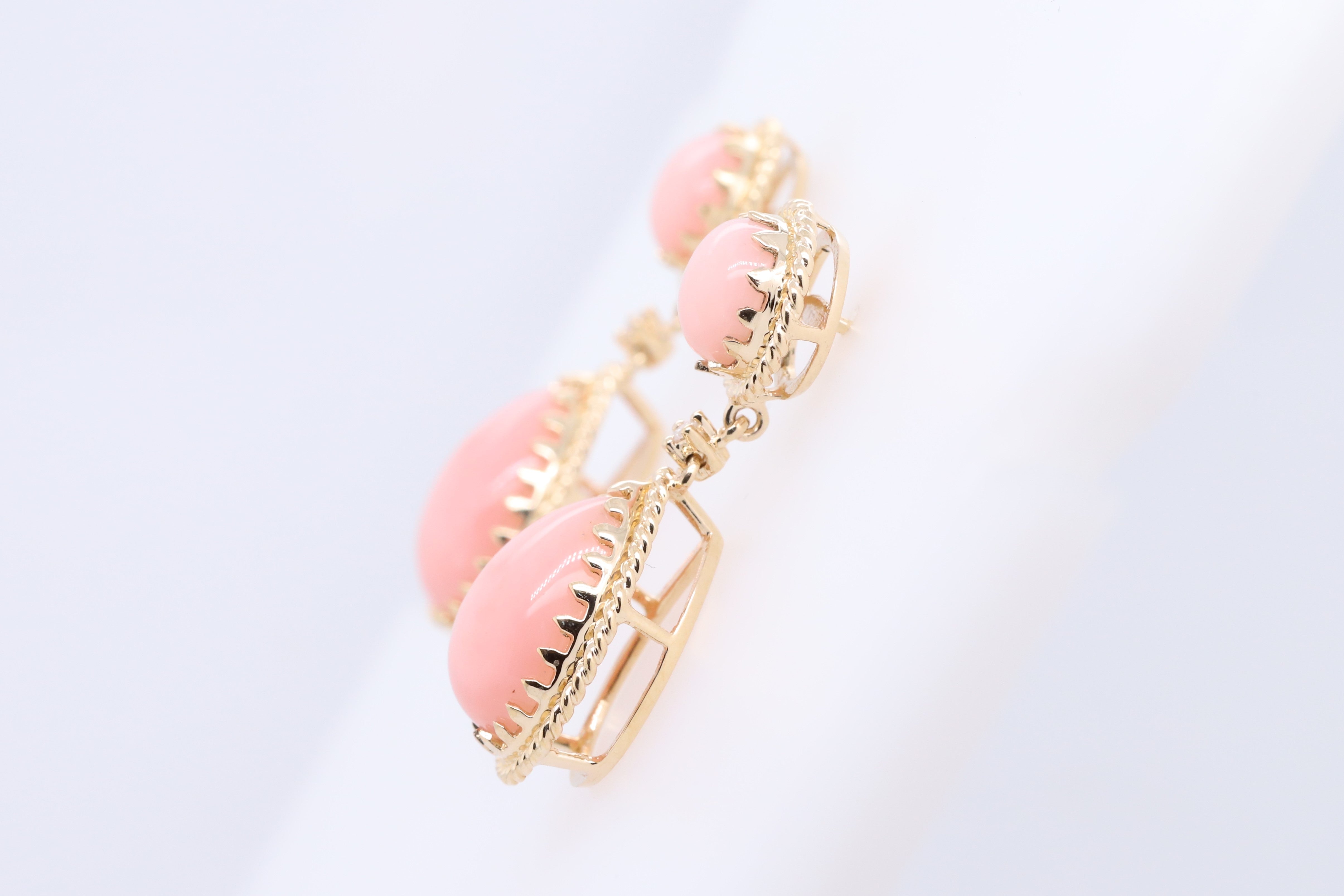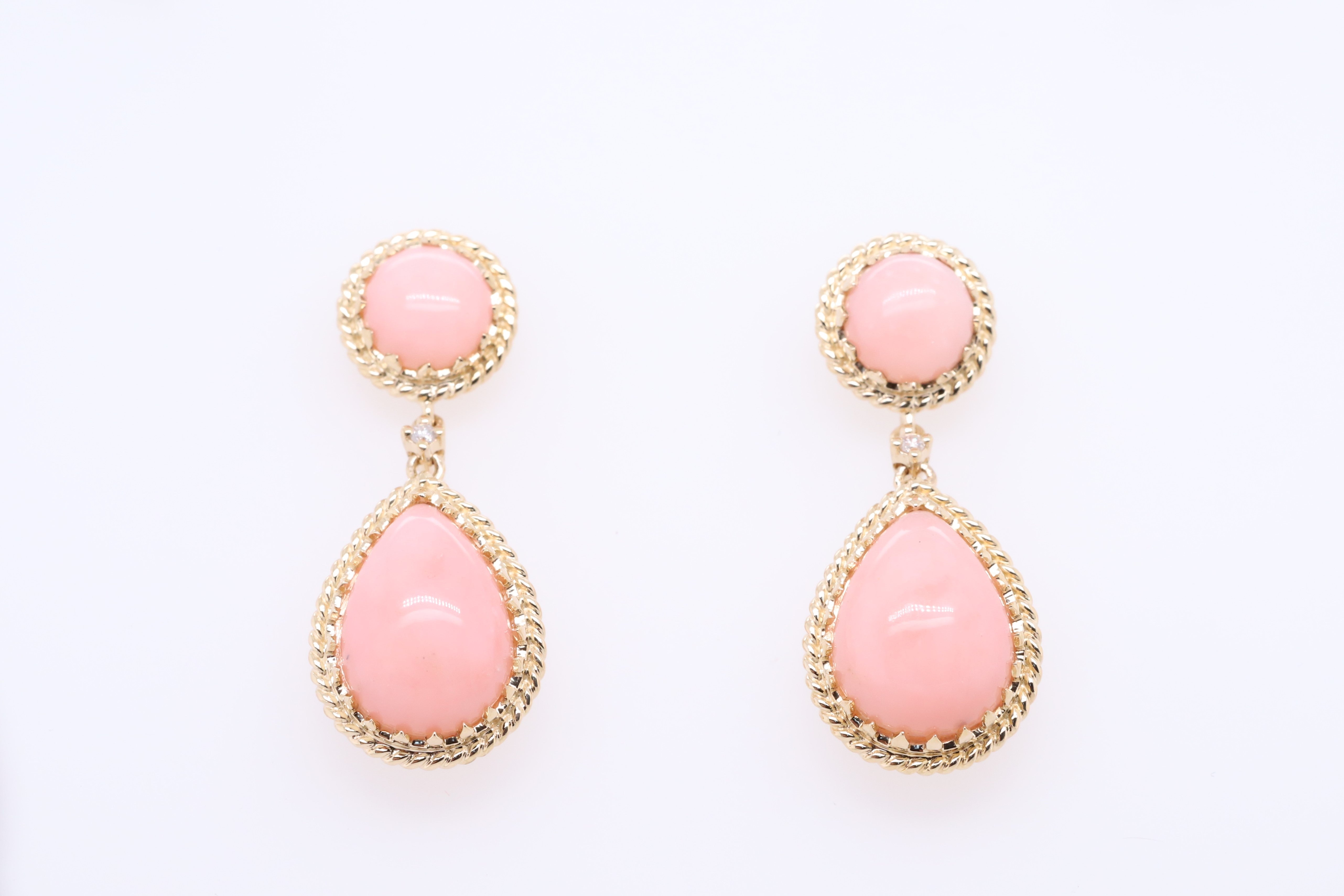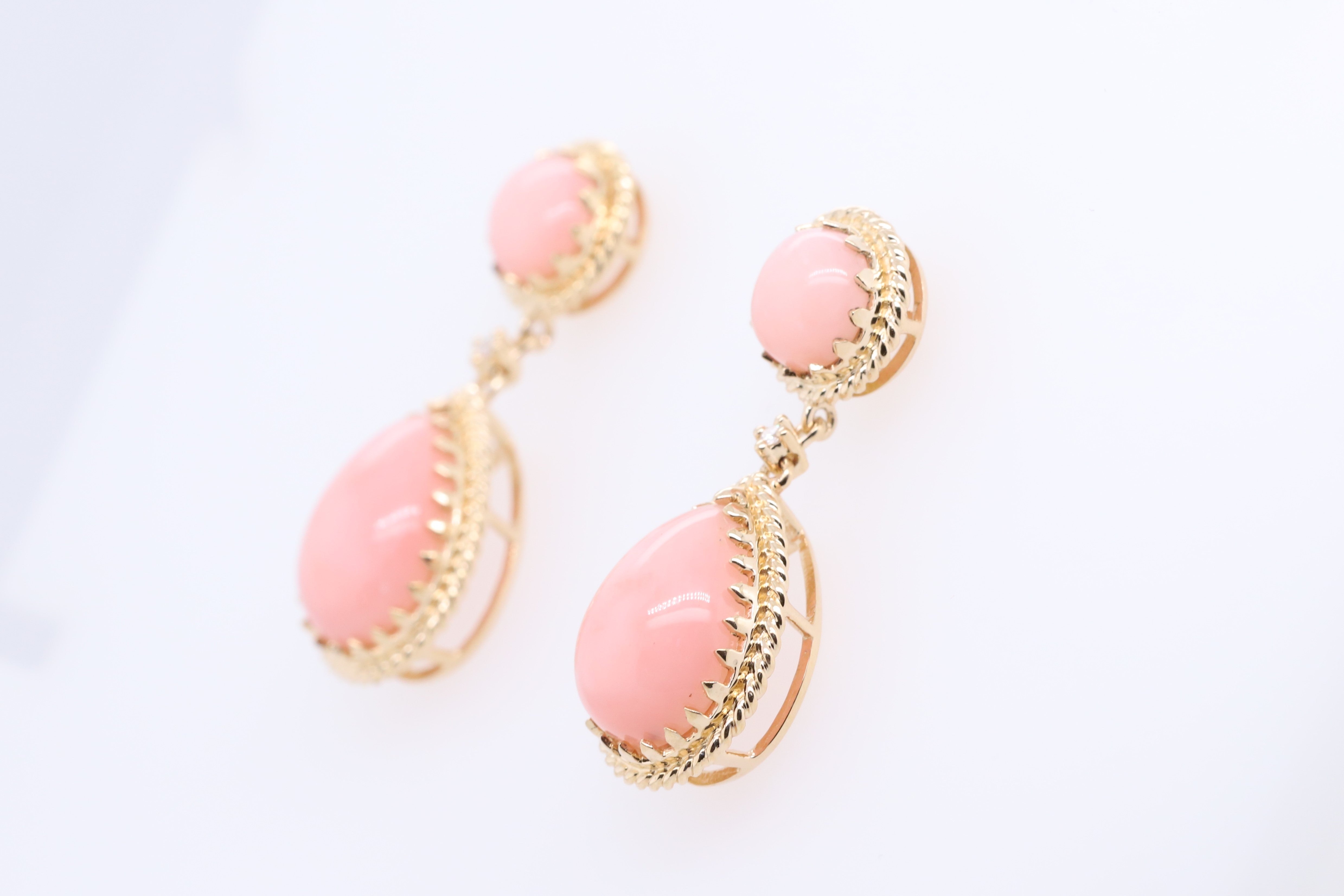 Decorate yourself in elegance with this Earring is crafted from 14-karat Yellow Gold by Gin & Grace. This Earring is made up of Peruvian Pink Opal Pear-Cut (4 pcs) 8.44 carat, and Round-cut White Diamond (2 Pcs) 0.02 Carat. This Earring is weight 5.21 grams. This delicate Earring is polished to a high finish shine.