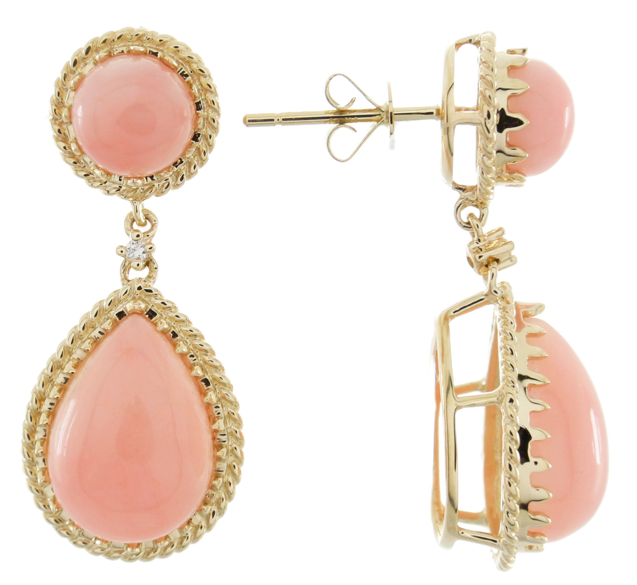 Decorate yourself in elegance with this Earring is crafted from 14-karat Yellow Gold by Gin & Grace. This Earring is made up of Peruvian Pink Opal Pear-Cut (4 pcs) 8.44 carat, and Round-cut White Diamond (2 Pcs) 0.02 Carat. This Earring is weight 5.21 grams. This delicate Earring is polished to a high finish shine.