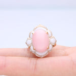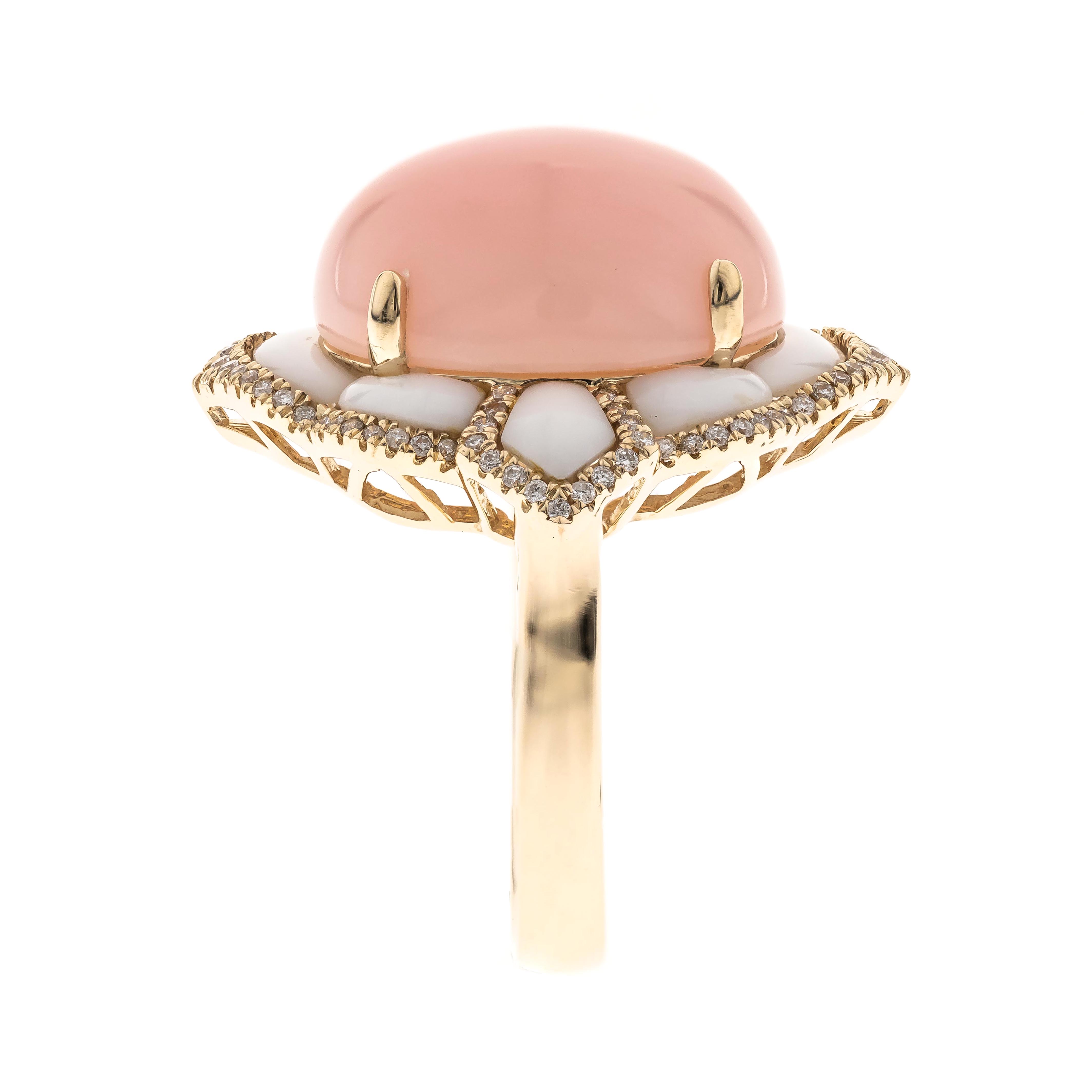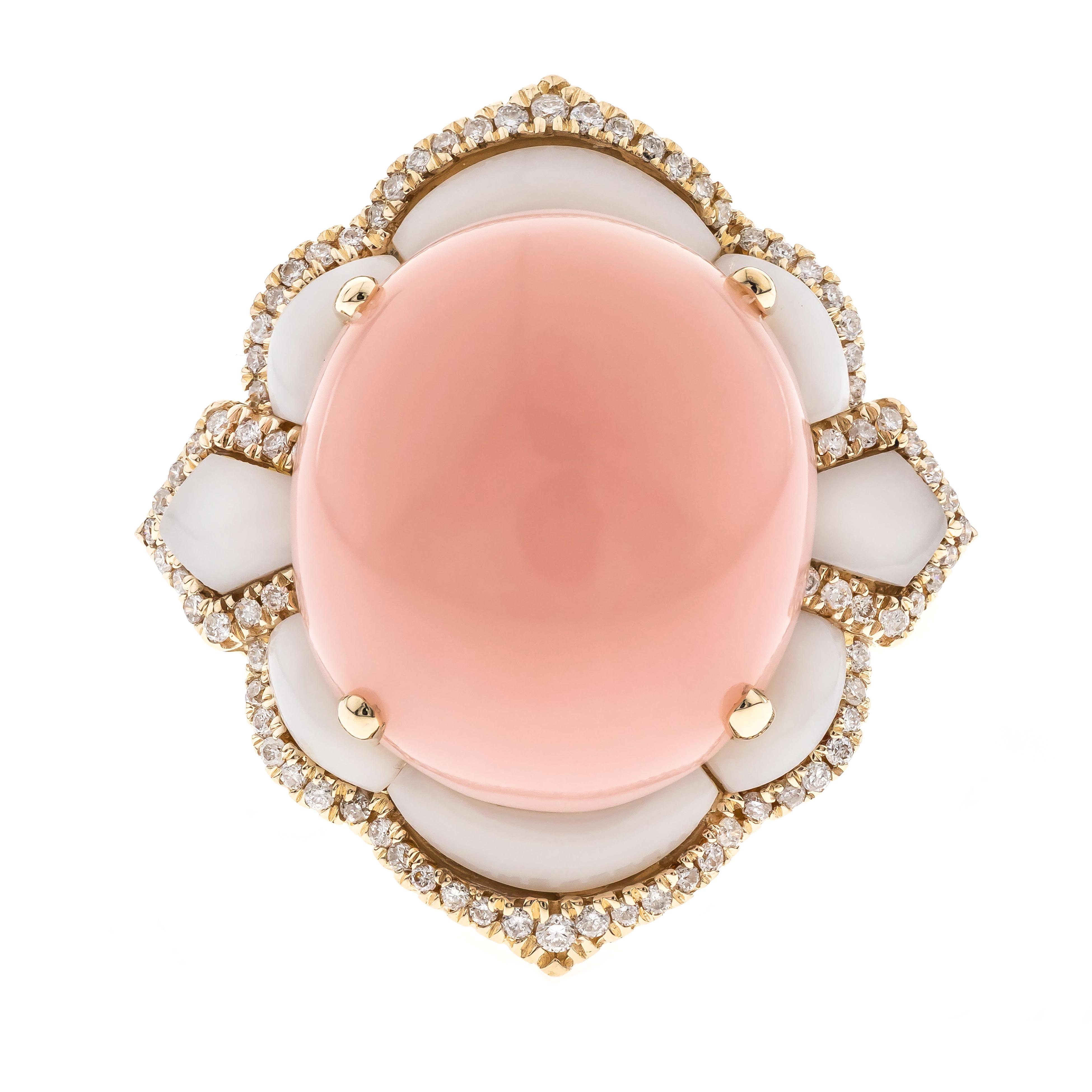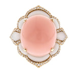 Decorate yourself in elegance with this Ring is crafted from 14K Yellow Gold by Gin & Grace. This Ring is made up of Oval-Cab (1 pcs) 8.06 carat Peruvian Pink Opal and Round-cut White Diamond (84 pcs) 0.23 and White Agate(8 pcs) 1.54 carat. This Ring weighs 4.22 grams. This delicate Ring is polished to a high finish shine.