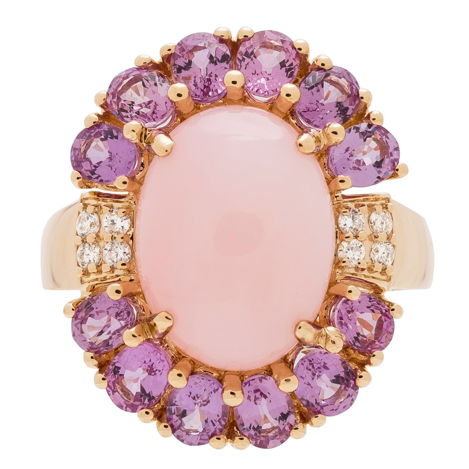 Decorate yourself in elegance with this Ring is crafted from 14K Yellow Gold by Gin & Grace. This Ring is made up of 10x14 mm Oval-Cat (1 pcs) 5.41 carat Peruvian Pink Opal, 3x4 mm Pear-cut Oval (12 pcs) 3.13 carat Pink Sapphire and Round-cut White Diamond (8 pcs) 0.10 carat. This Ring is weight 4.57 grams. This delicate Ring is polished to a high finish shine.