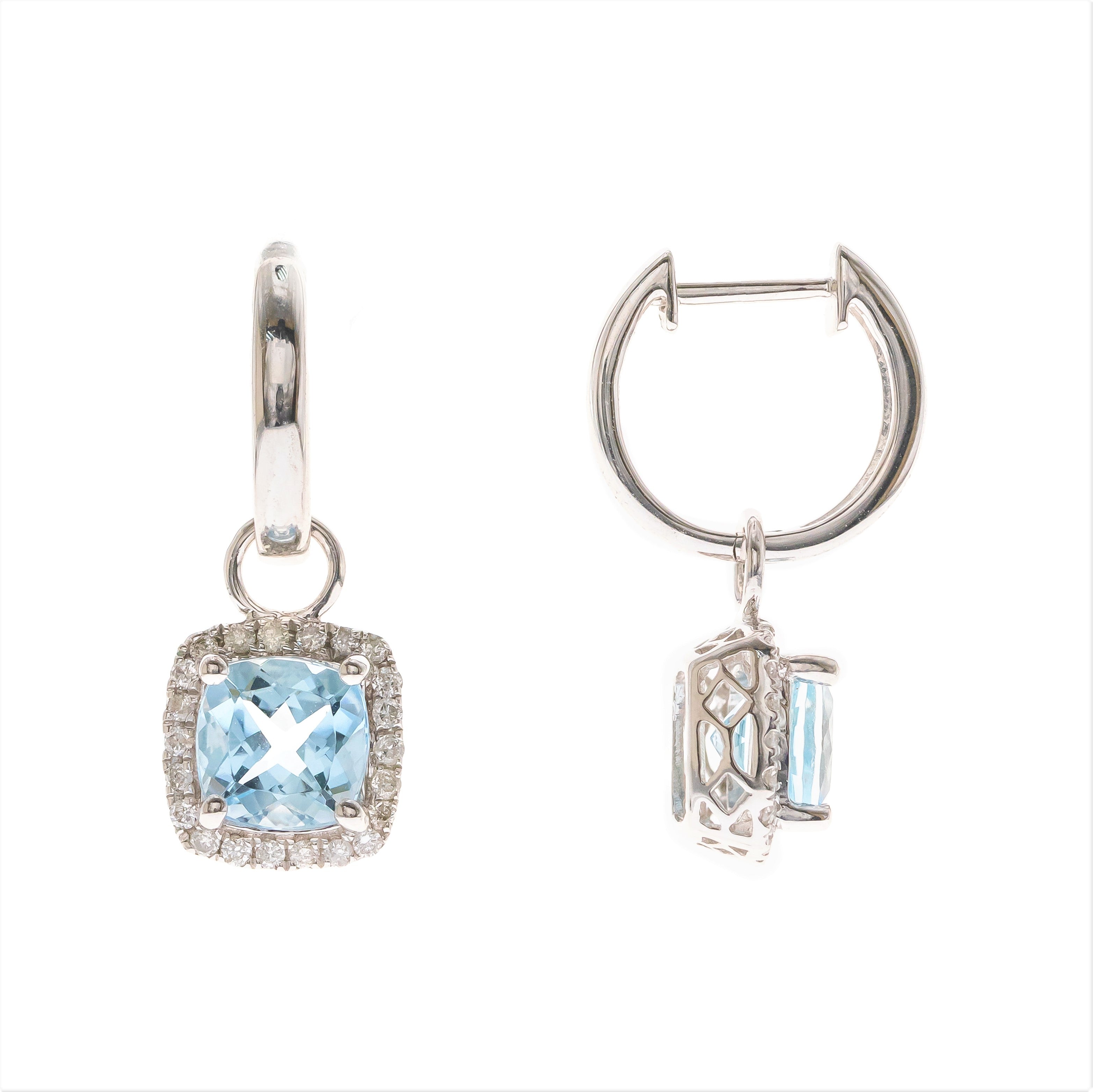 Stunning, timeless and classy eternity Engagement Earring . Decorate yourself in luxury with this Gin & Grace Earring. This Earring is made up of 60.MM Cushion-Cut Prong Setting Genuine Brazilian Aquamarine (2 pcs) 1.75 Carat and Round-Cut Prong Setting Natural Diamond (44 pcs) 0.22 Carat accent stones for a lovely design. This Earring is weight 2.56 grams. The Earring is crafted of shining 14-karat White Gold and is completed by a highly polished finish.