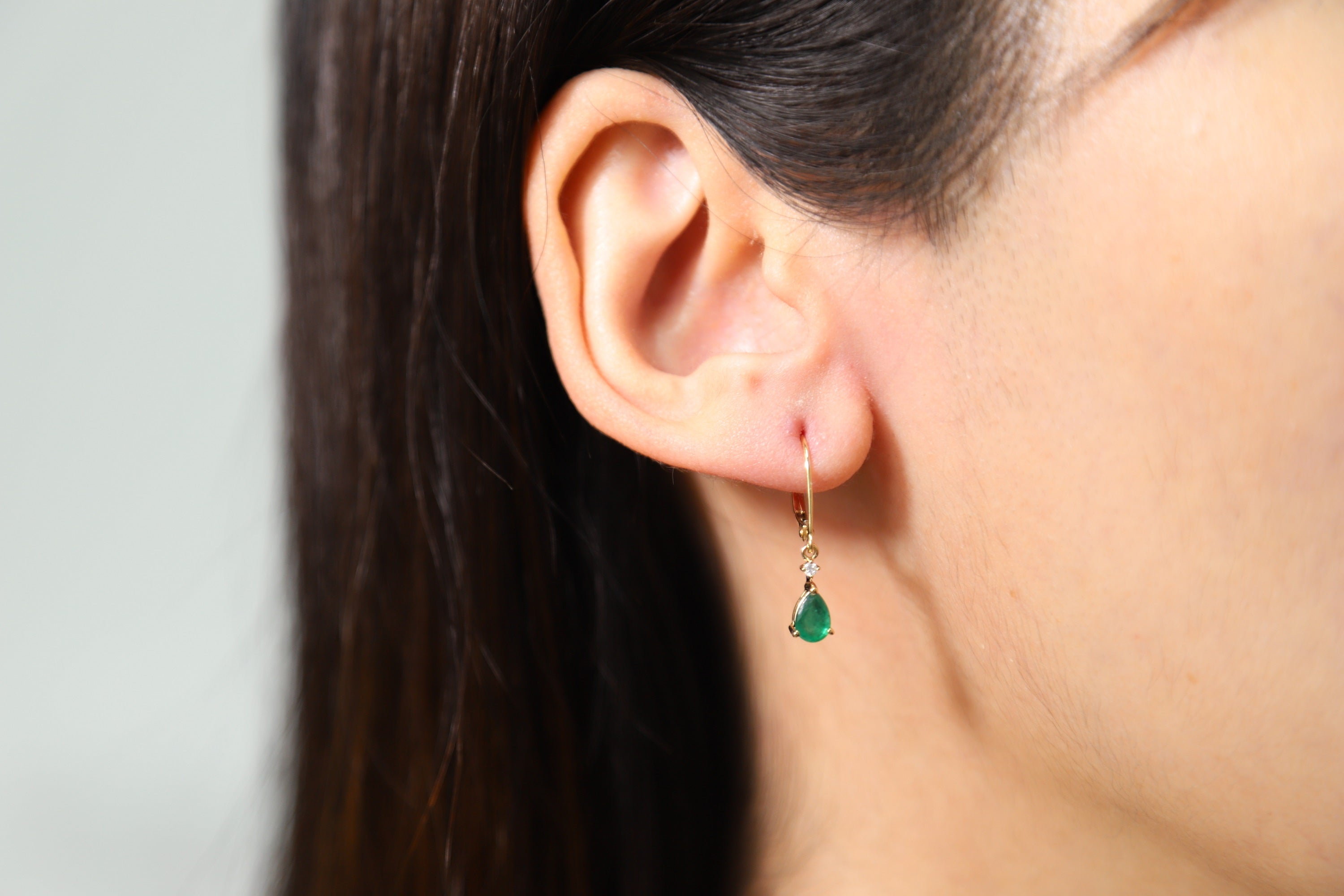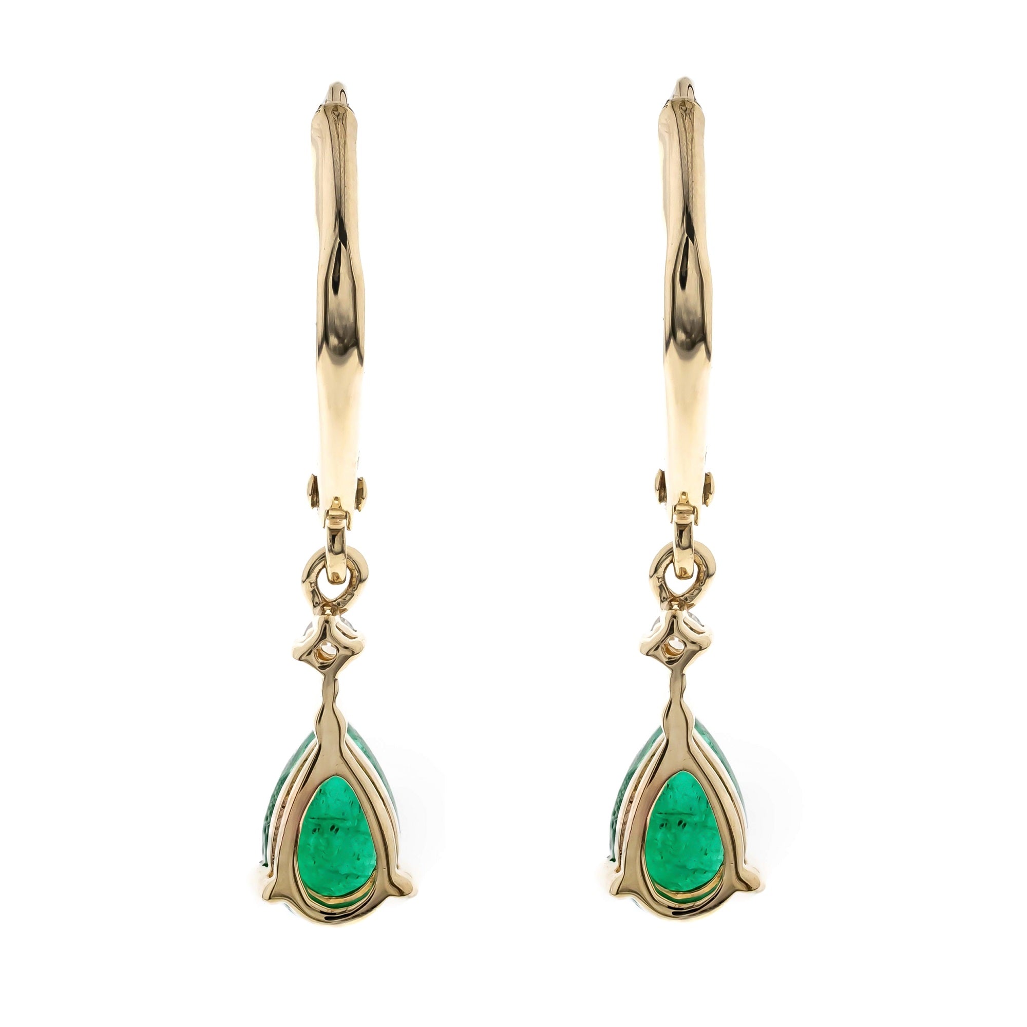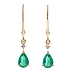 Decorate yourself in elegance with this Earring is crafted from 14K Yellow Gold by Gin & Grace Earring. This Earring is made up of 4X6 mm Pear-Cut prong setting Zambian Emerald (2 pcs) 0.72 Carat and Round-Cut prong setting Diamond (2 pcs) 0.03 Carat. This Earring is weight 1.0 grams. This delicate Earring is polished to a high finish shine. Simple lever back clasps keep these earrings securely fastened.