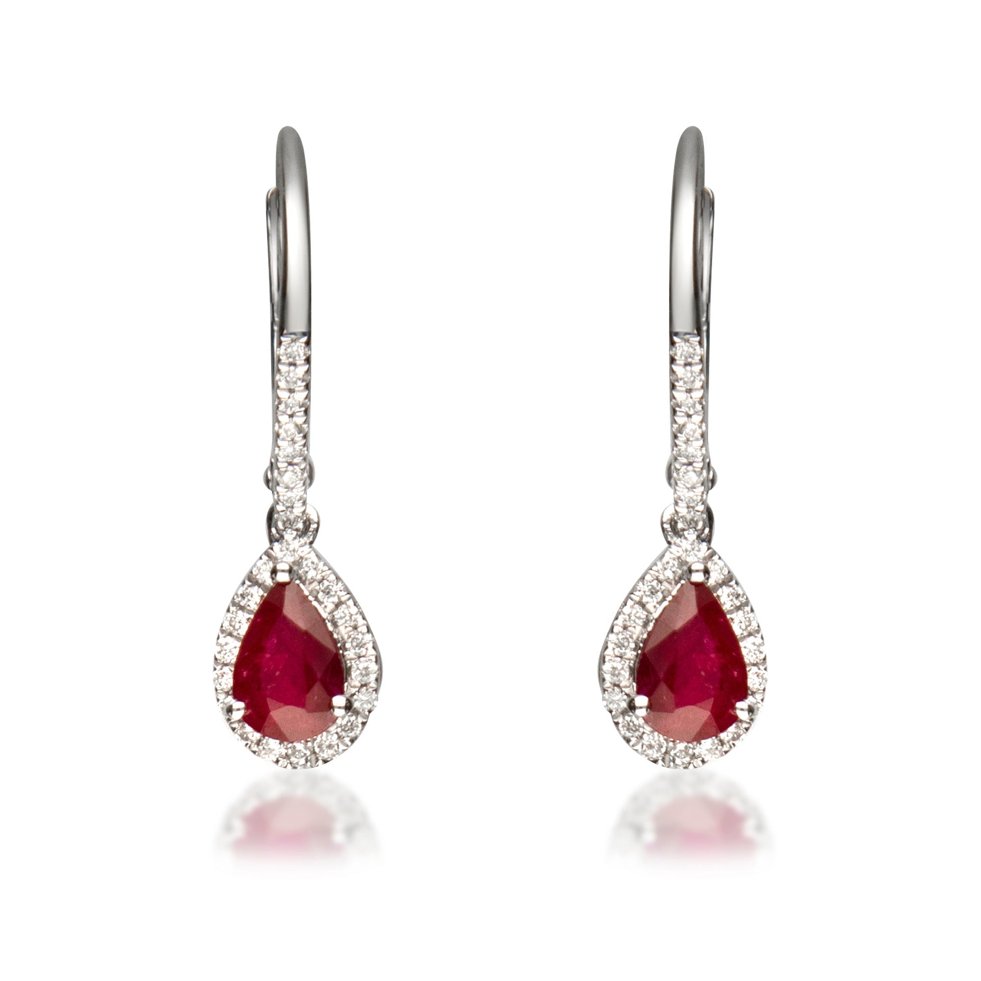 Decorate yourself in elegance with this Earring is crafted from 10-karat white Gold by Gin & Grace. This Earring is made up Pear-cut ruby (2 pcs) 0.95 carat and Round-cut White Diamond (52 Pcs) 0.17 Carat. This Earring is weight 1.42 grams. This delicate Earring is polished to a high finish shine.