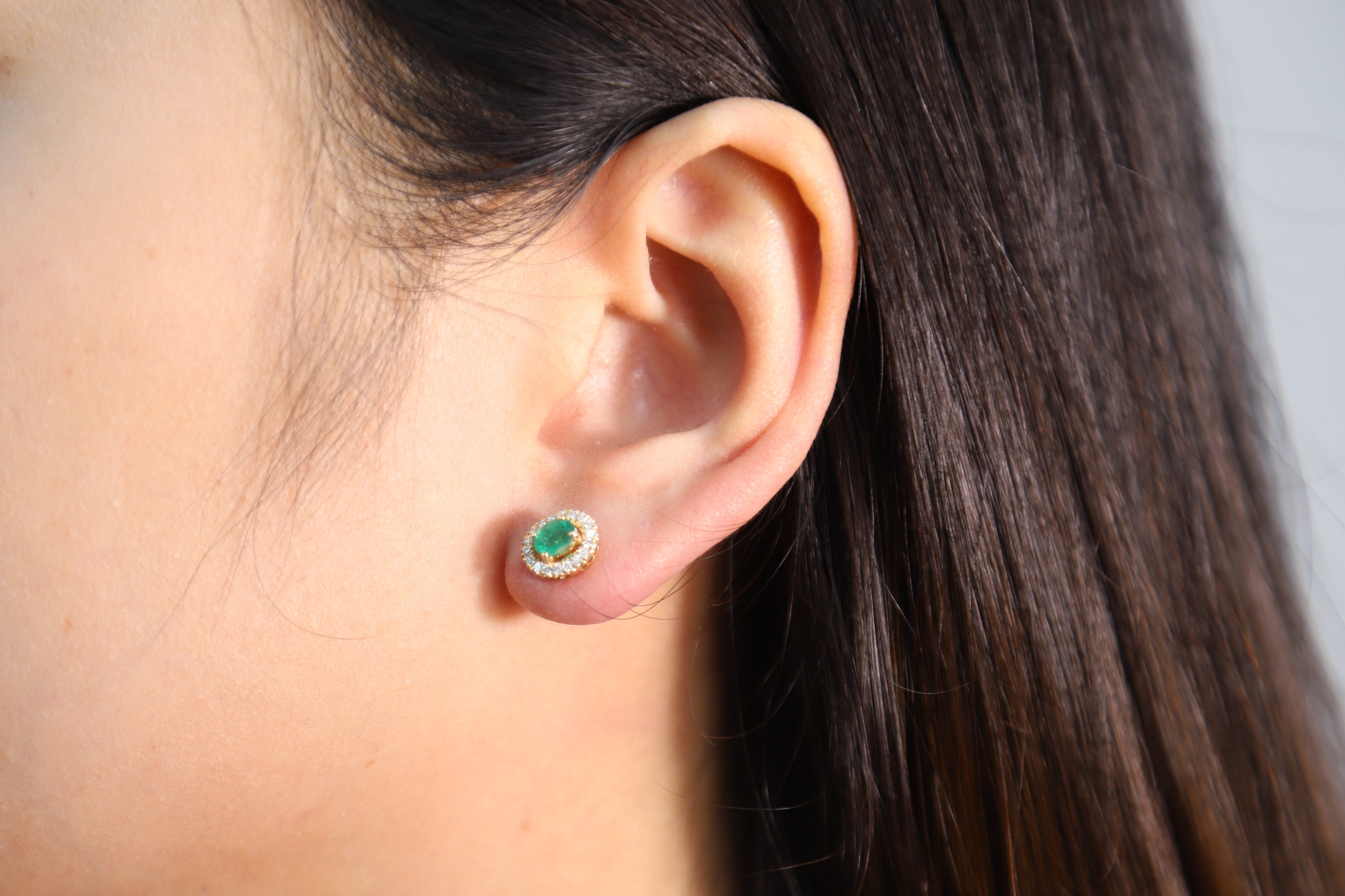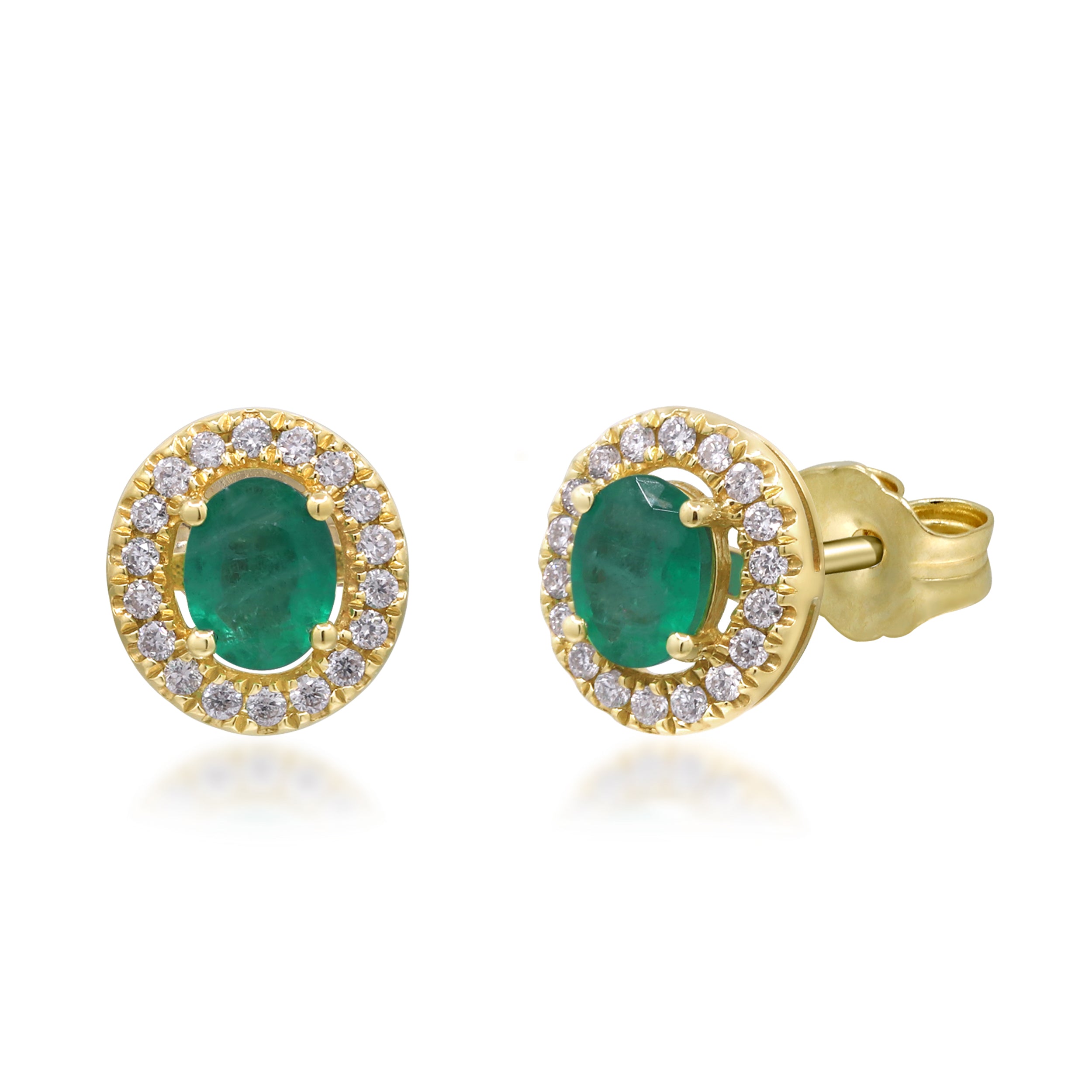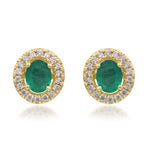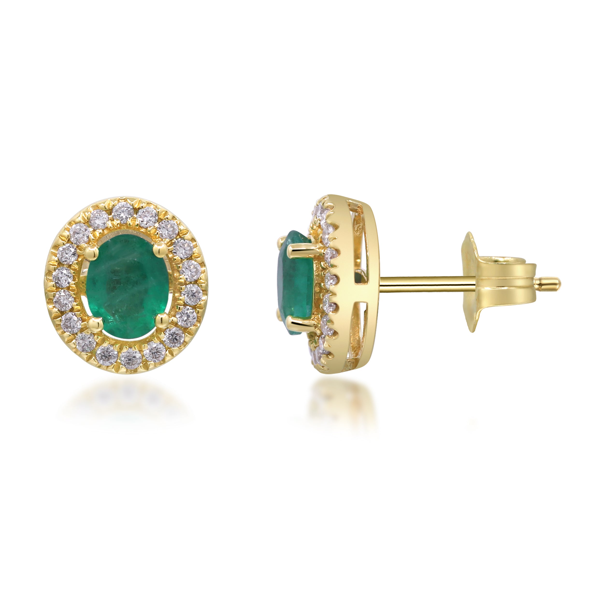 Decorate yourself in elegance with this Earring is crafted from 10-karat Yellow Gold by Gin & Grace. This Earring is made up of Zambian Emerald 4*5 mm Oval- cut (2 pcs) 0.67 carat and Round-cut White Diamond (36 Pcs) 0.18 Carat. This Earring is weight 1.71 grams. This delicate Earring is polished to a high finish shine.