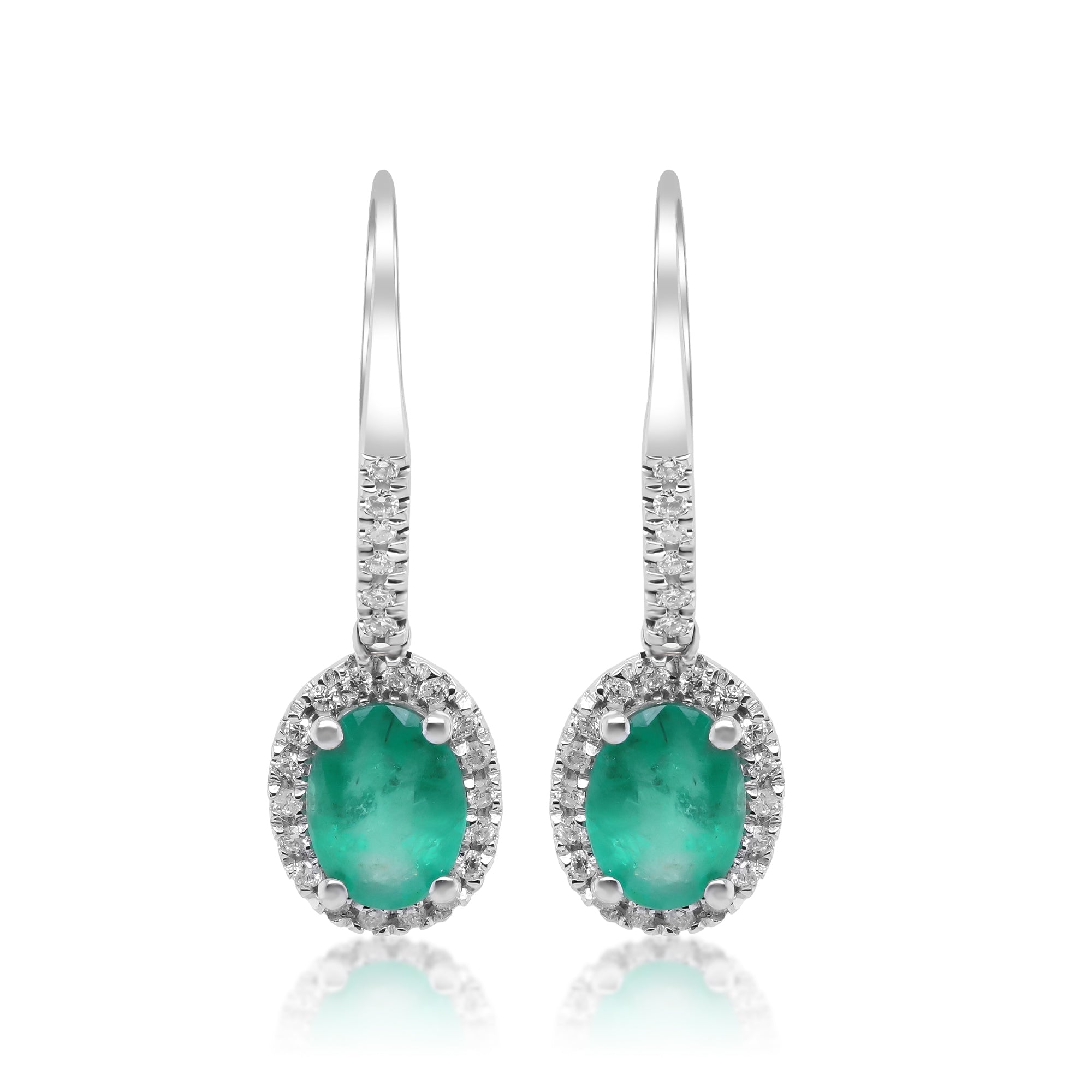 Details Crafted of 14-karat white gold, these elegant dangle earrings showcase oval-cut Gin & Grace Natural Zambian Emeralds bordered by a halo of Natural white diamonds. A high polish finish and leverback clasps complete the look of these beautiful earrings. Style: Dangle Gemstone colors: Green Gemstone shapes: Oval Two prong-set oval-cut Zambian Emeralds each measure 5 mm wide x 7 mm long Gemstone weight: 1 6/13 carats Total gemstone weight: 1 6/13 carats Diamonds: 48 Natural Diamond cut: Round-cut measure 1 mm Diamond weight: 1/4 carats Color: G-H Clarity: I1-I2 Setting: Prong Metal: 14k white hold Finish: High polish Clasp: Leverback Metal weight: 1.67 grams Earring dimensions: 7 mm wide x 24 mm long x 4 mm deep