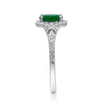 Indulge in the luxurious elegance of this Gin & Grace ring, meticulously crafted from 14-karat white gold. This exquisite piece showcases a 7x5 mm oval-cut emerald, weighing 0.68 carat, as its focal point. The Zambian Emerald's mesmerizing green hue is beautifully enhanced by the surrounding brilliance of 28 round-cut white diamonds, totaling 0.13 carats. These diamonds are expertly prong-set, creating a captivating display of sparkle and radiance.