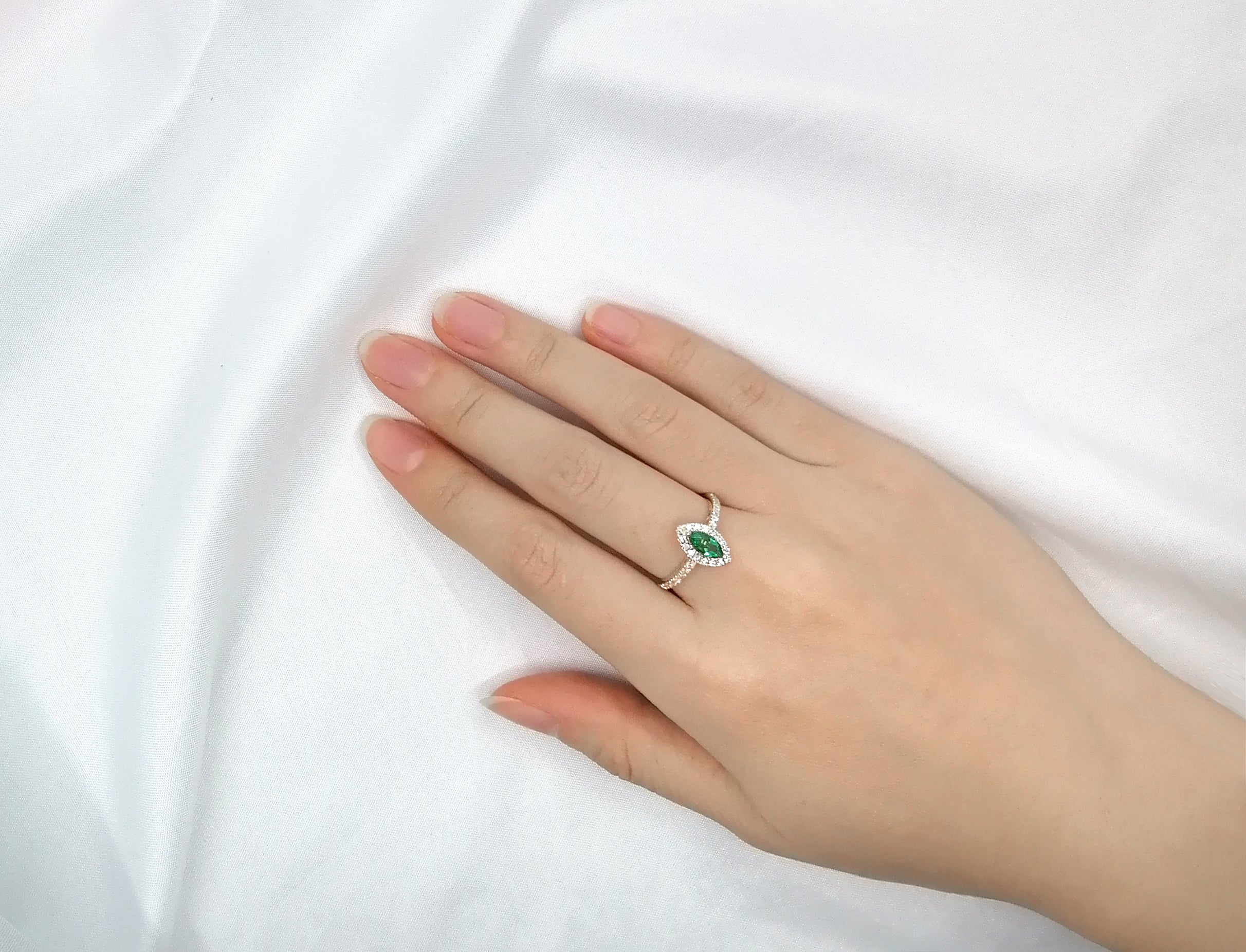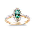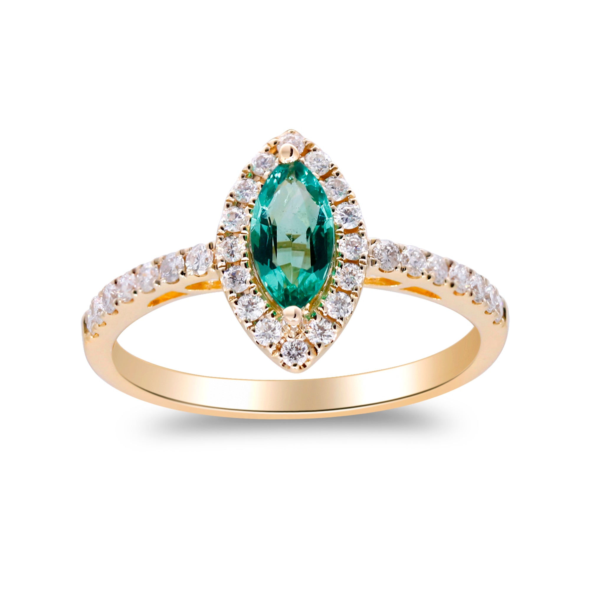 Decorate yourself in elegance with this Ring is crafted from 14-karat Yellow Gold by Gin & Grace. This Ring is made up of Marquise-Cut Emerald (1 pcs) 0.48 carat and Round-cut White Diamond (30 Pcs) 0.34 Carat. This Ring is weight 1.86 grams. This delicate Ring is polished to a high finish shine.
