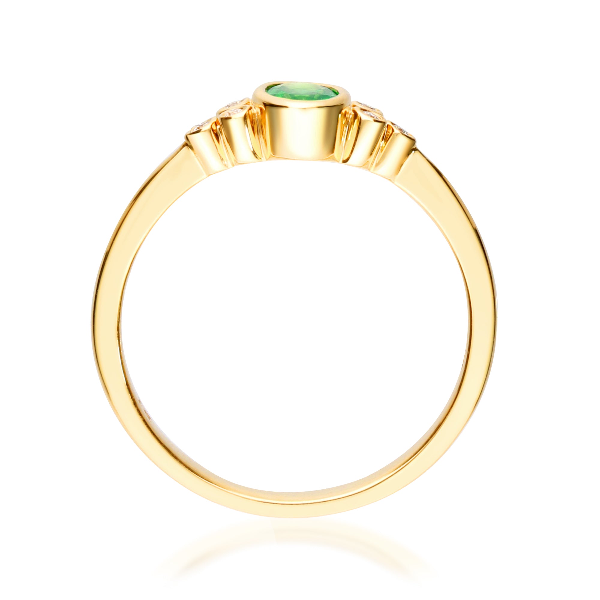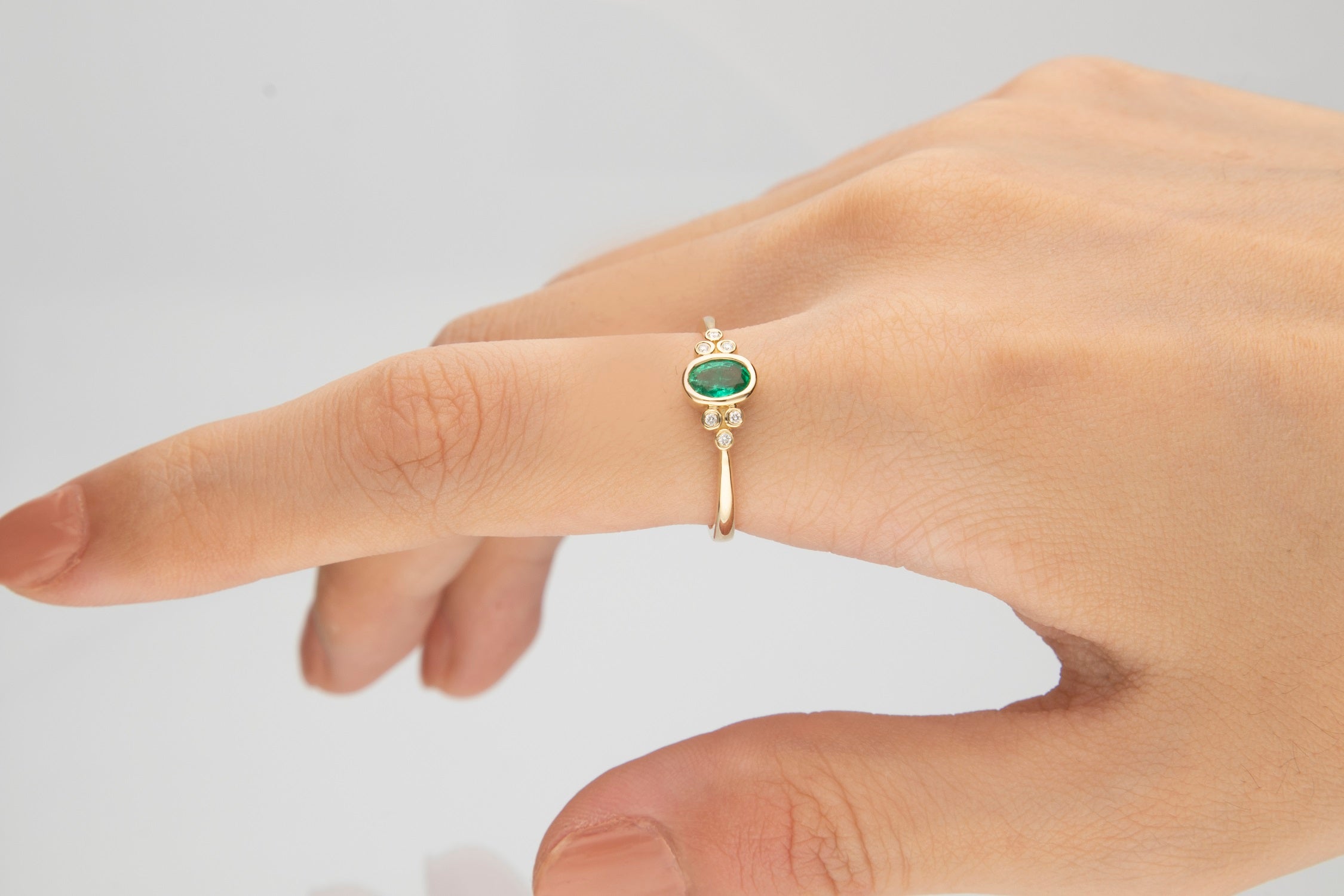 Stunning, timeless and classy eternity Unique ring. Decorate yourself in luxury with this Gin & Grace ring. The 10k Yellow Gold jewelry boasts Oval-Cut Bezel Setting Natural Emerald (1pcs) 0.45 Carat and Round-Cut Bezel Setting Diamond (6pcs) 0.03 Carat accent stones for a lovely design. This ring is weight 2.0 grams. Crafted with 10k Yellow Gold, this delicate Ring is polished to a high finish shine.