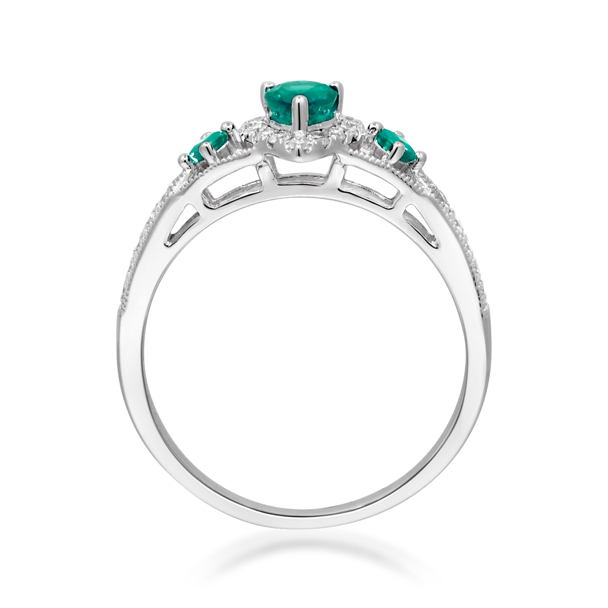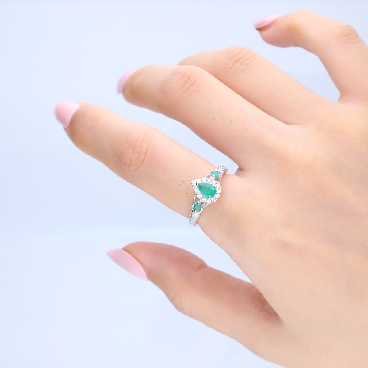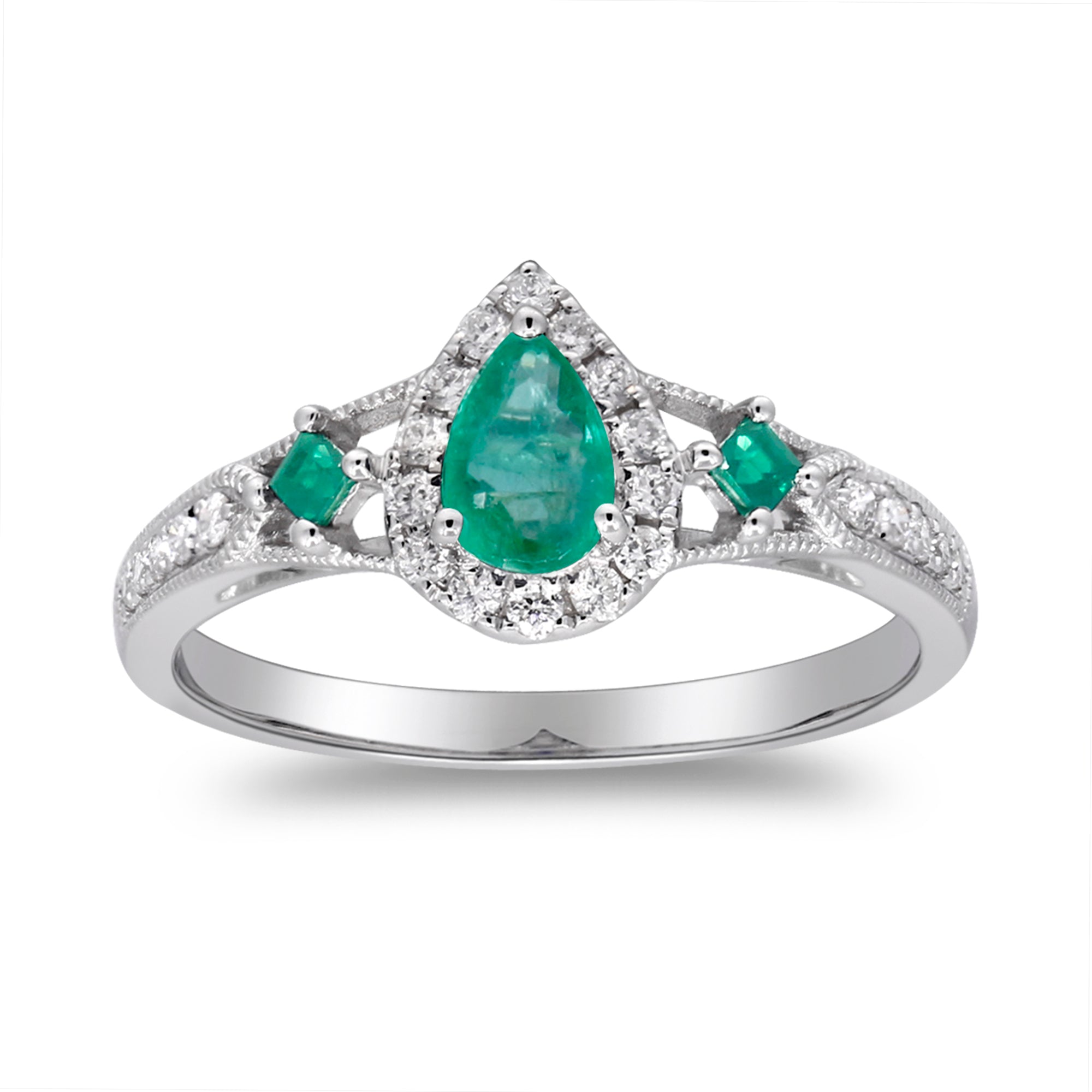 Accentuating the pear-cut emerald are two square-cut Zambian Emerald, each measuring 2.0 mm and weighing a total of 0.10 carats. These emeralds complement the centerpiece and enhance the overall allure of the ring.