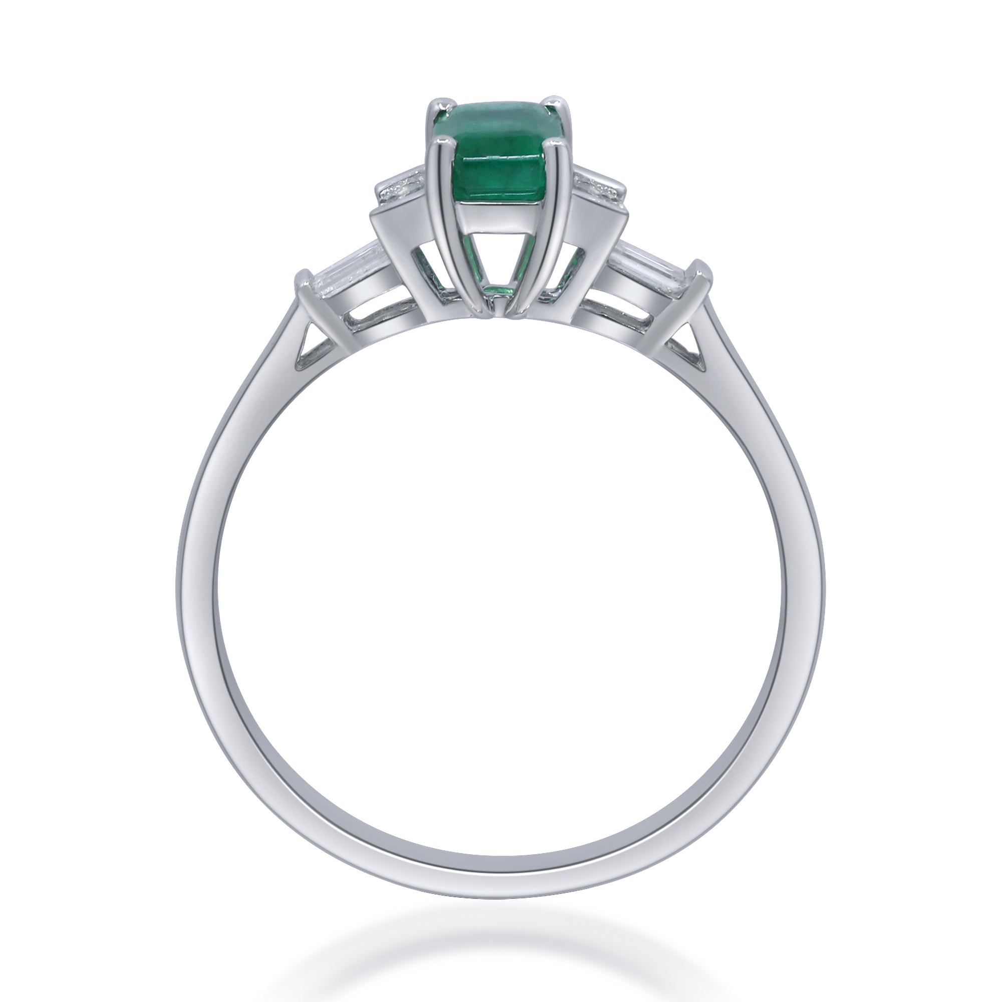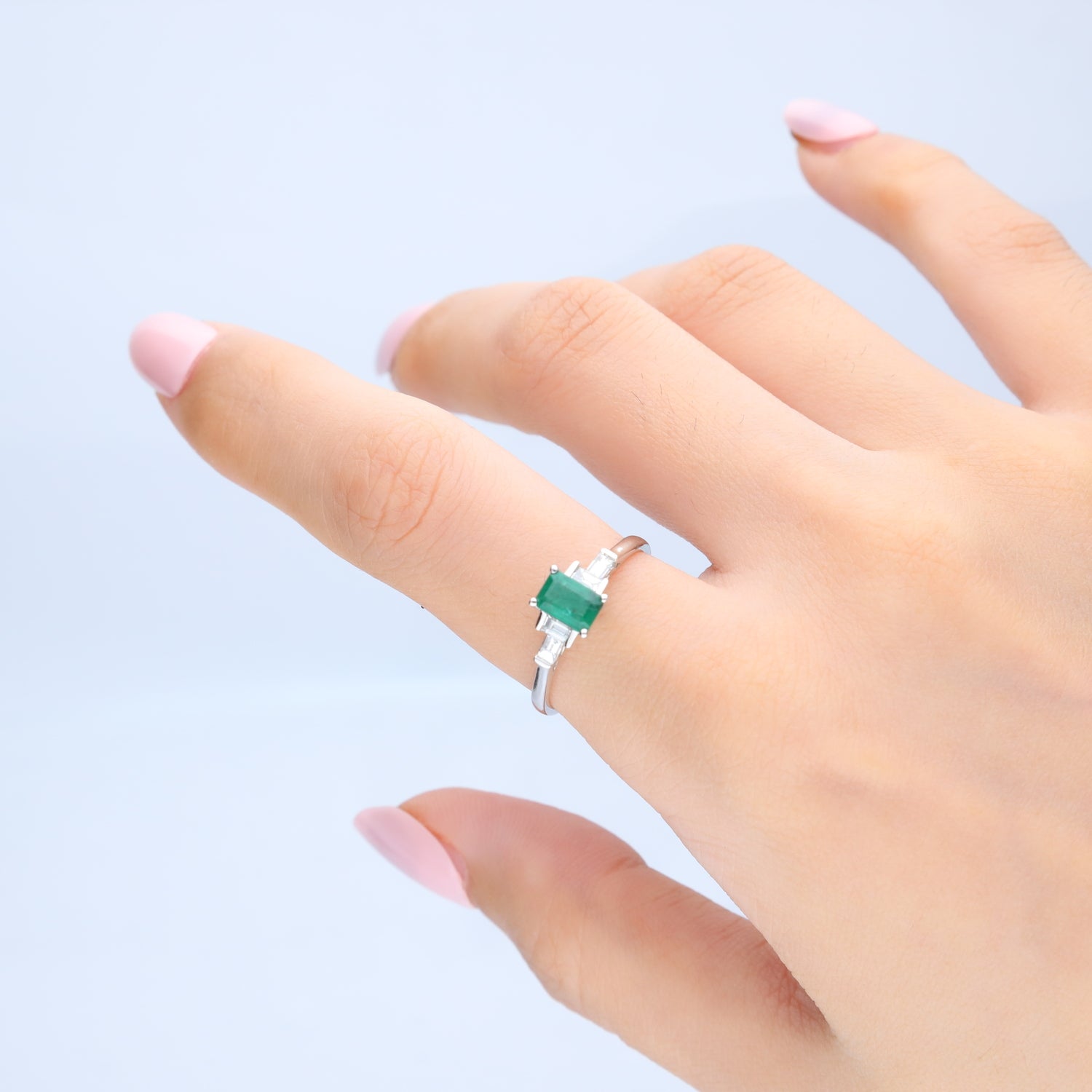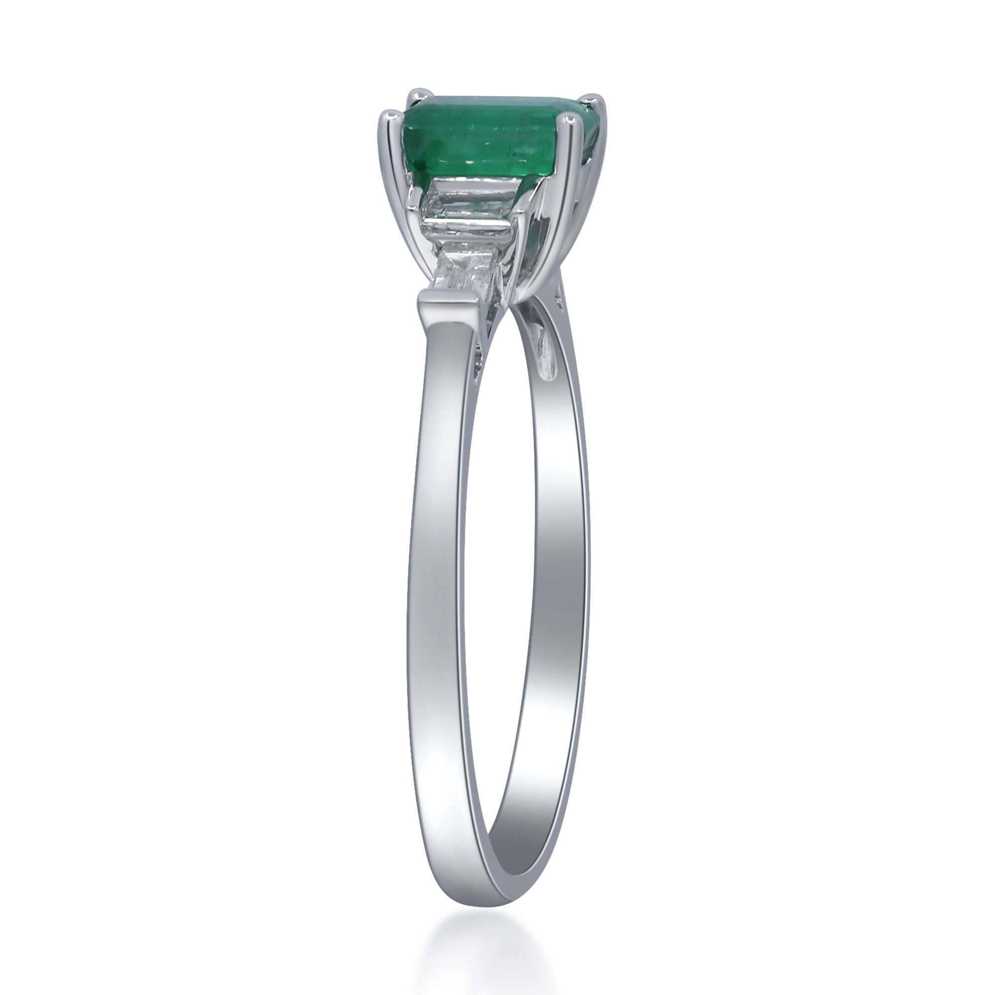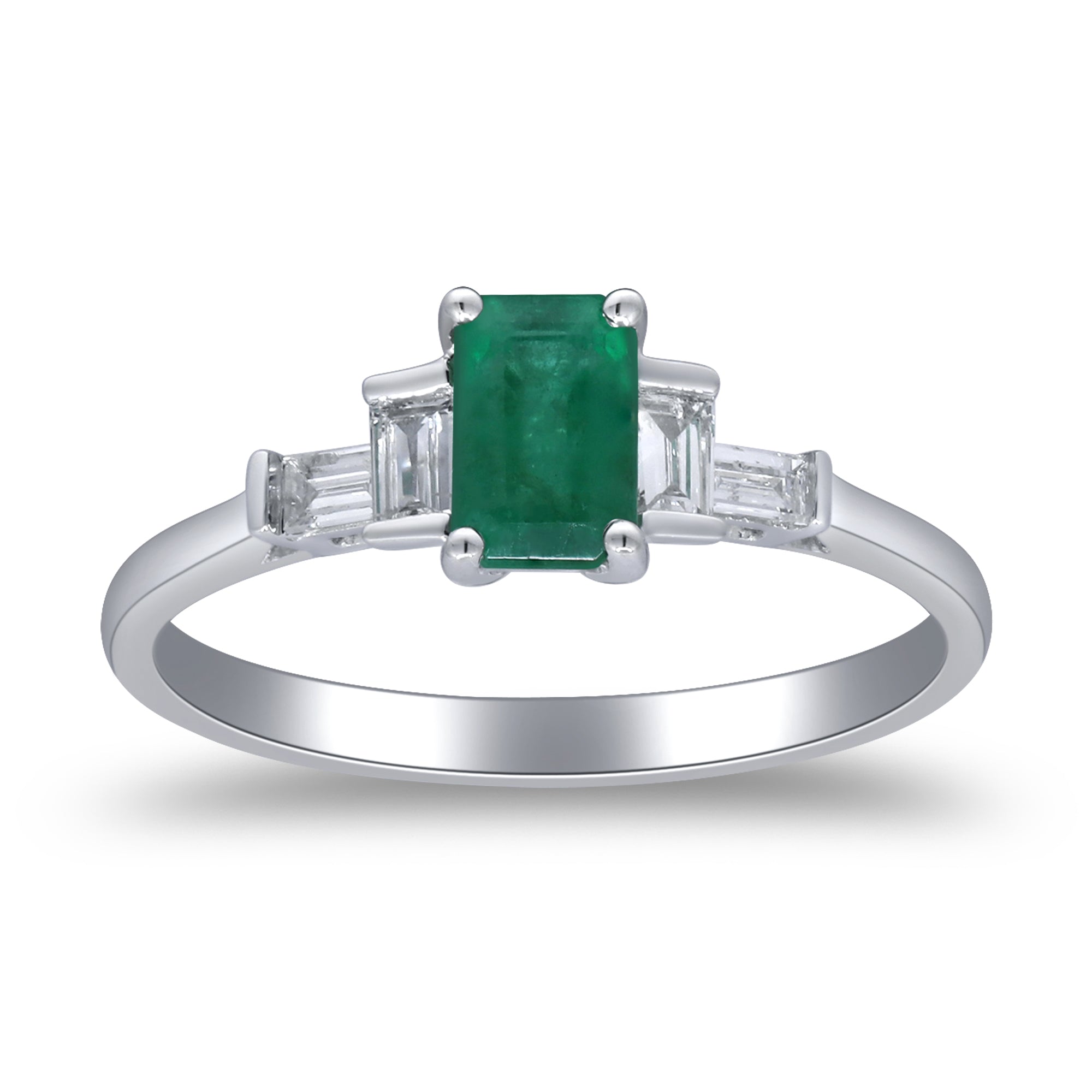 Decorate yourself in elegance with this Ring is crafted from 10-karat White Gold by Gin & Grace. This Ring is made up of Emerald-cut (1 pcs) 0.57 carat Emerald and Baguette-cut White Diamond (4 Pcs) 0.23 Carat. This Ring is weight 1.73 grams. This delicate Ring is polished to a high finish shine.