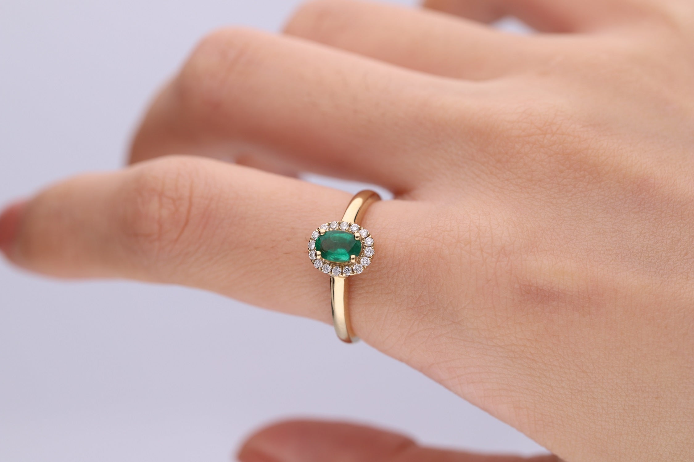 The focal point of this eye-catching ring is the large oval-cut emerald, measuring 4x6mm. With a gemstone weight of 0.40 carats, the Zambian Emerald radiates a mesmerizing green hue, captivating the senses and symbolizing natural beauty.
