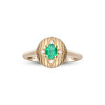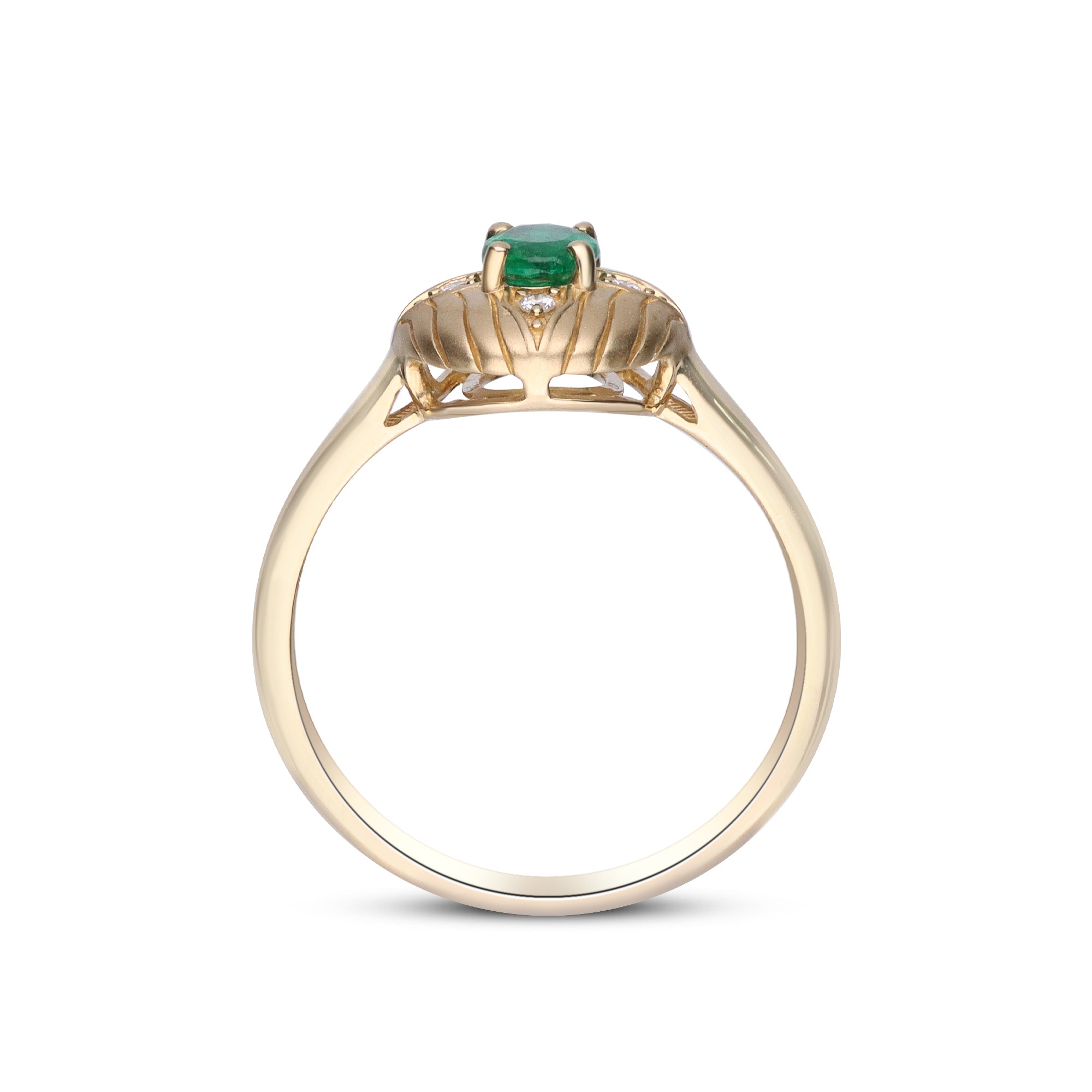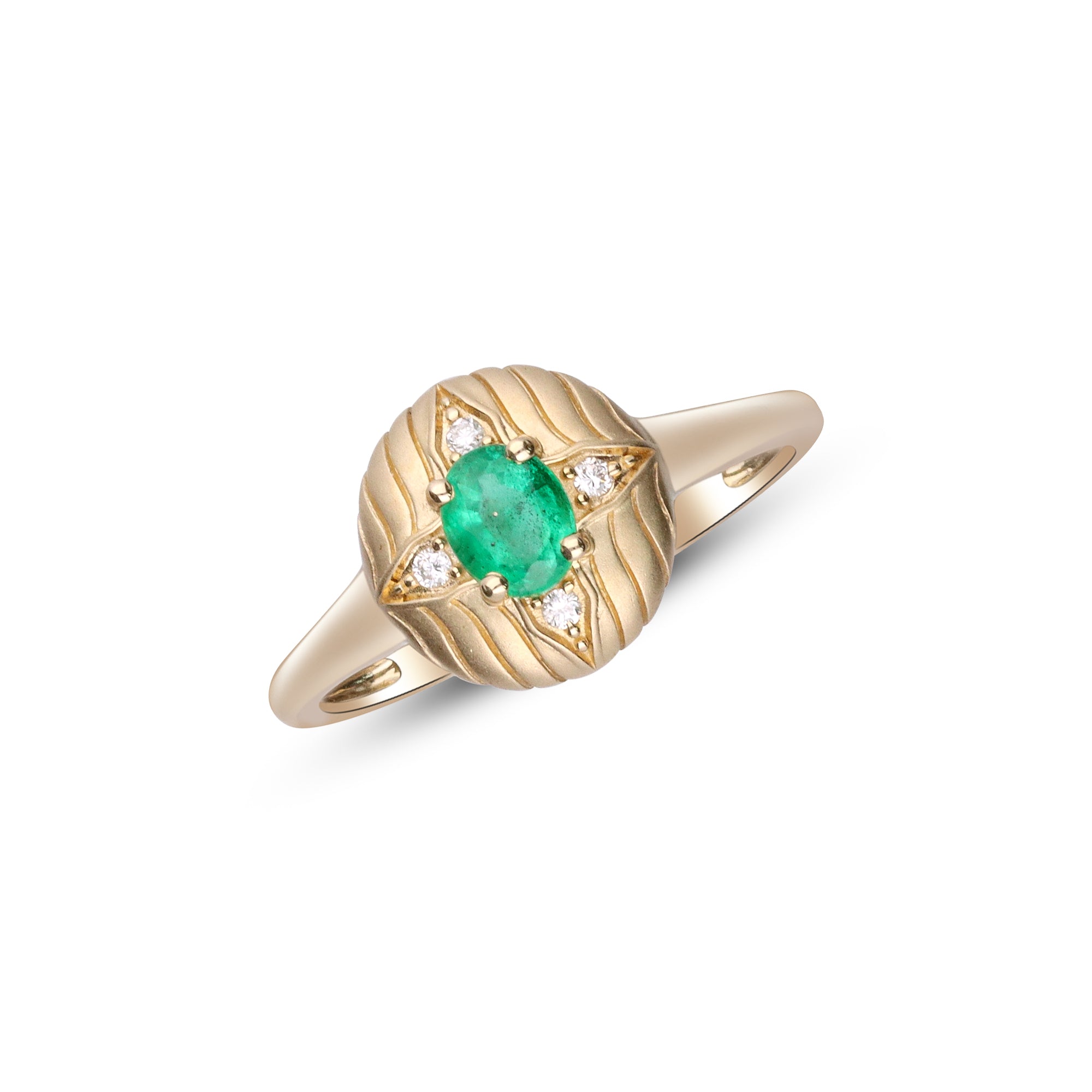 Elegant with a sculptural twist, the Verdant Echo ring features a 4x5mm (0.35ct) oval-cut emerald, glowing with rich green vibrance. Set into a 14K yellow gold dome-style band, the ring is accented with four white diamonds (0.04ct total), subtly nestled within carved detailing that adds texture and depth. The carved dome silhouette offers a bold yet refined presence, blending vintage charm with modern craftsmanship. A distinctive piece that captures natural beauty and artistic design in perfect harmony.