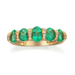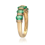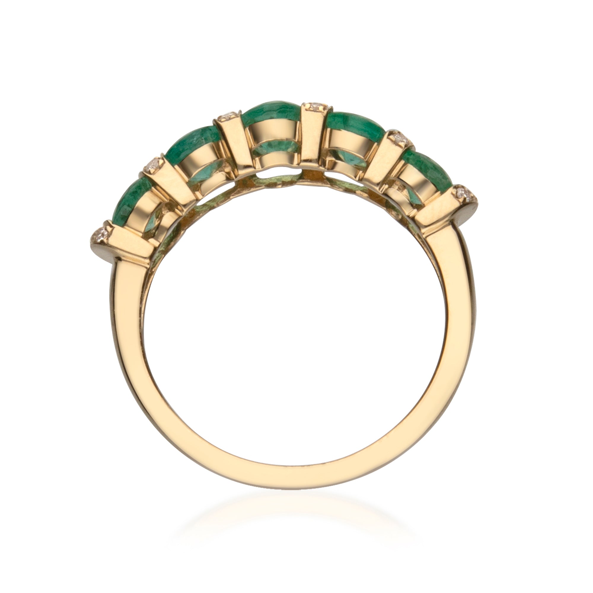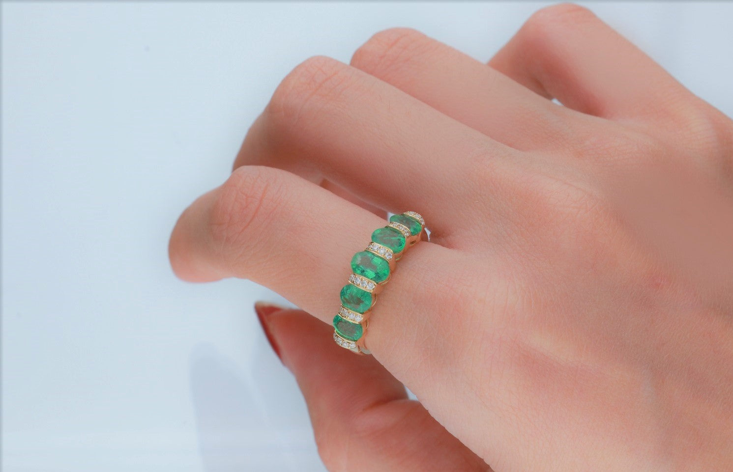 Stunning, timeless and classy eternity Unique Ring. Decorate yourself in luxury with this Gin & Grace Ring. This Ring is made up of Oval-Cut Prong Setting Natural Emerald (5 pcs) 1.61 Carat and Round-Cut Prong Setting Diamond (24 pcs) 0.12 Carat accent stones for a lovely design. This Ring is weight 2.0 grams. The Ring is crafted of shining 14K Yellow Gold and is completed by a highly polished finish.