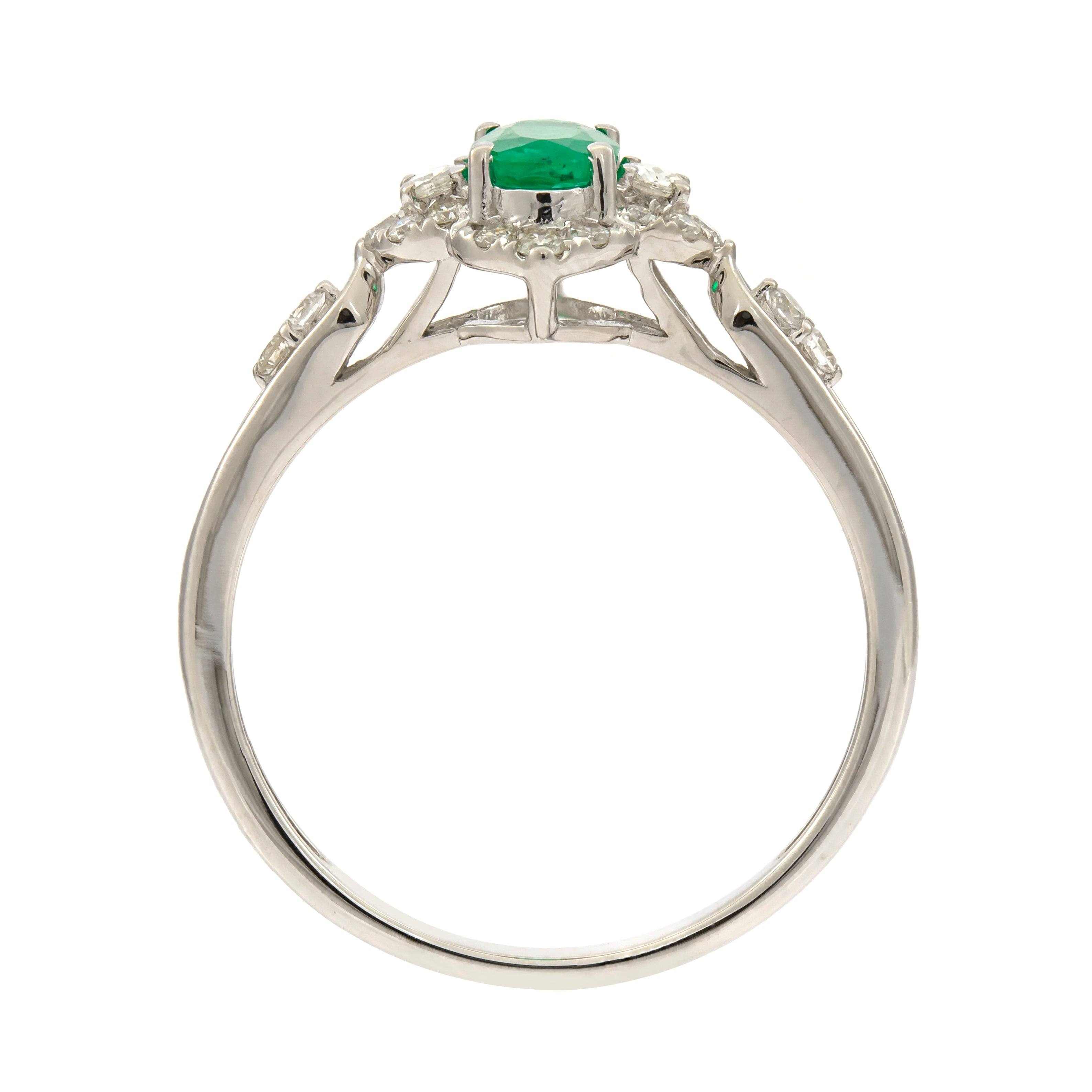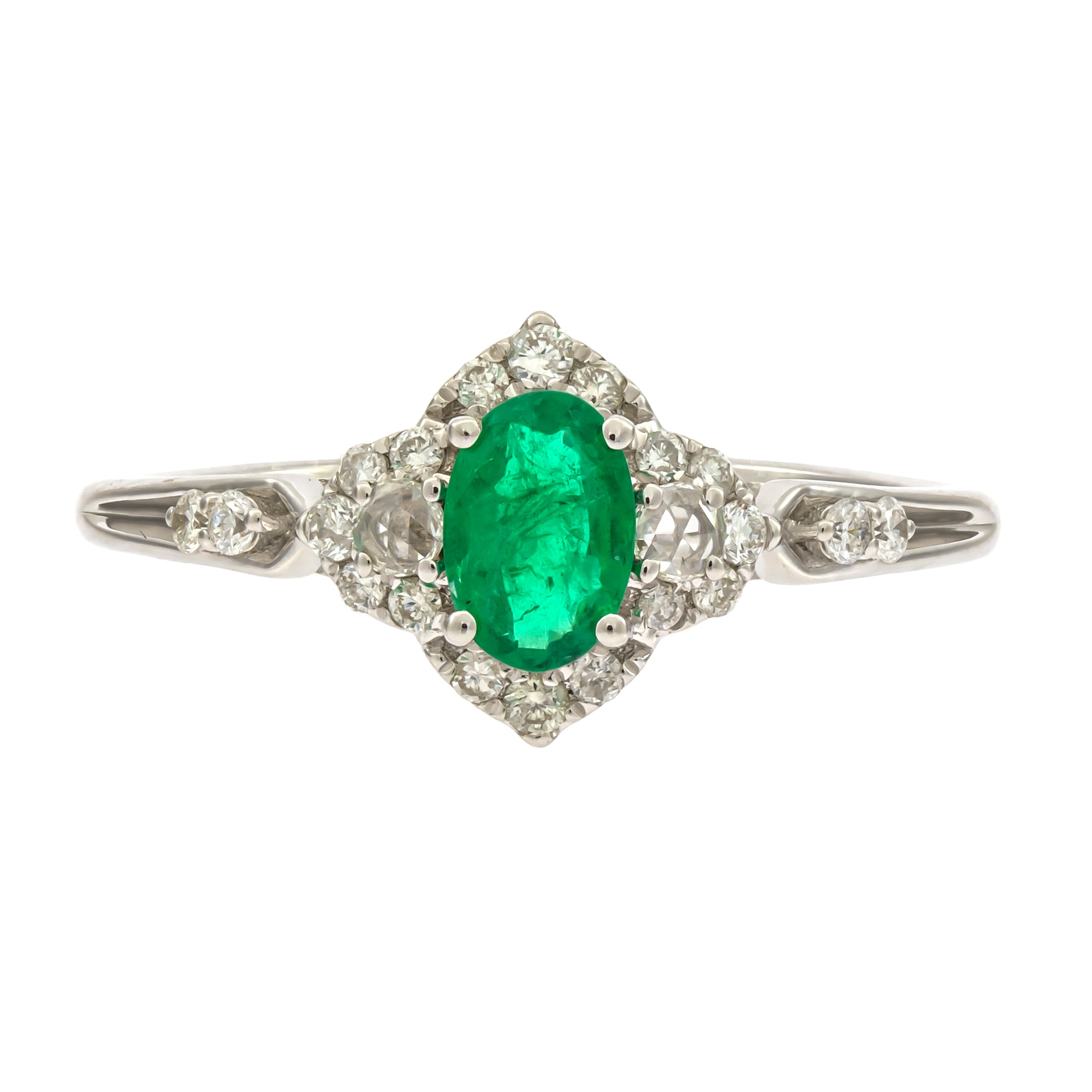 Stunning, timeless and classy eternity Unique Ring. Decorate yourself in luxury with this Gin & Grace Ring. The 10K White Gold jewelry boasts Oval-Cut Prong Setting Natural Emerald (1 pc) 0.45 Carat, along with Natural Round cut white Diamond (22 Pcs) 0.23 Carat, accent stones for a lovely design. This Ring is weight 1.71 grams. Crafted with 10K White Gold, this delicate Ring is polished to a high finish shine.