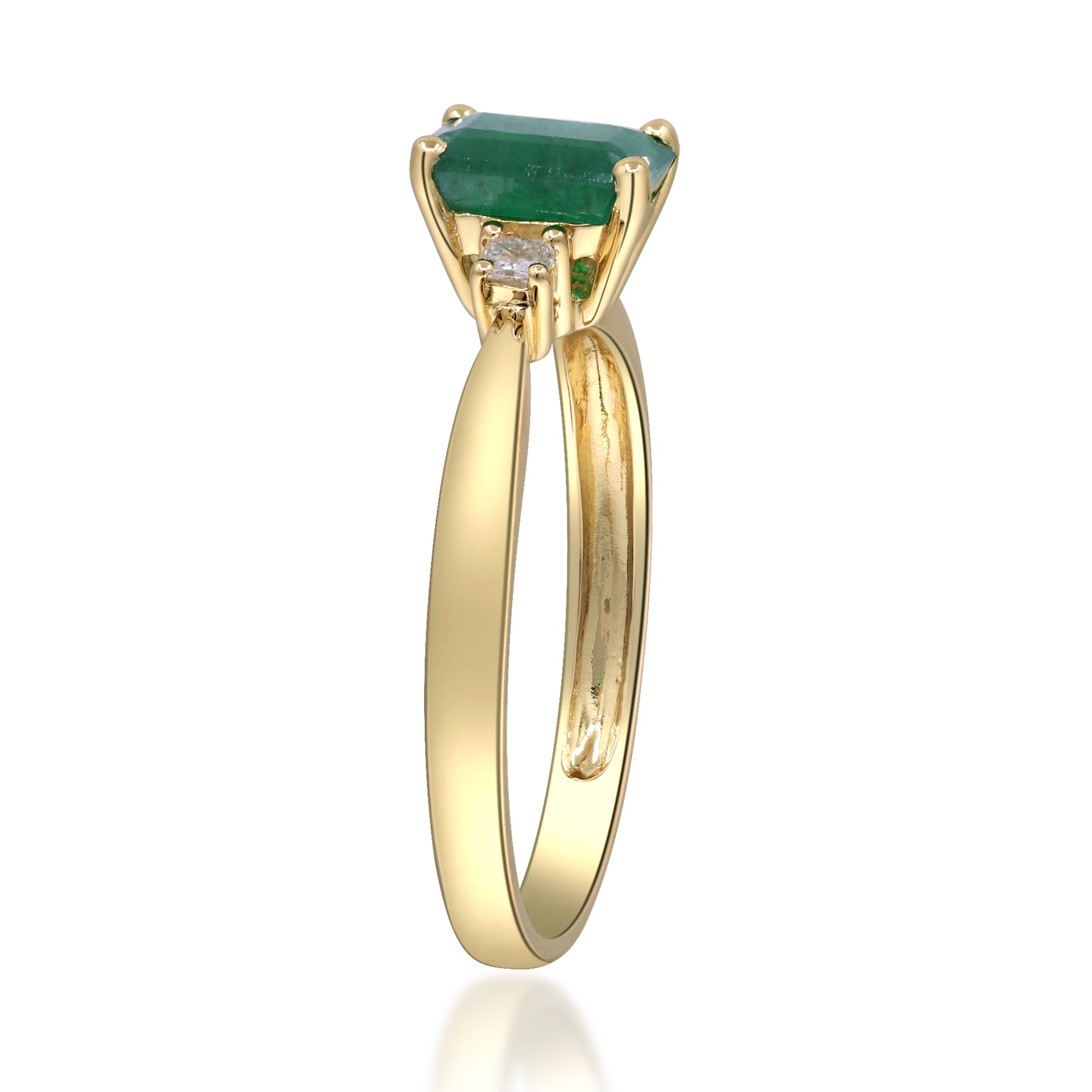 Stunning, timeless and classy eternity Unique Ring. Decorate yourself in luxury with this Gin & Grace Ring. The 10K Yellow Gold jewelry boasts Emerald-Cut Prong Setting Natural Emerald (1 pc) 0.93 Carat, along with Natural Round cut white Diamond (2 Pcs) 0.10 Carat, accent stones for a lovely design. This Ring is weight 1.85 grams. Crafted with 10K Yellow Gold, this delicate Ring is polished to a high finish shine.
