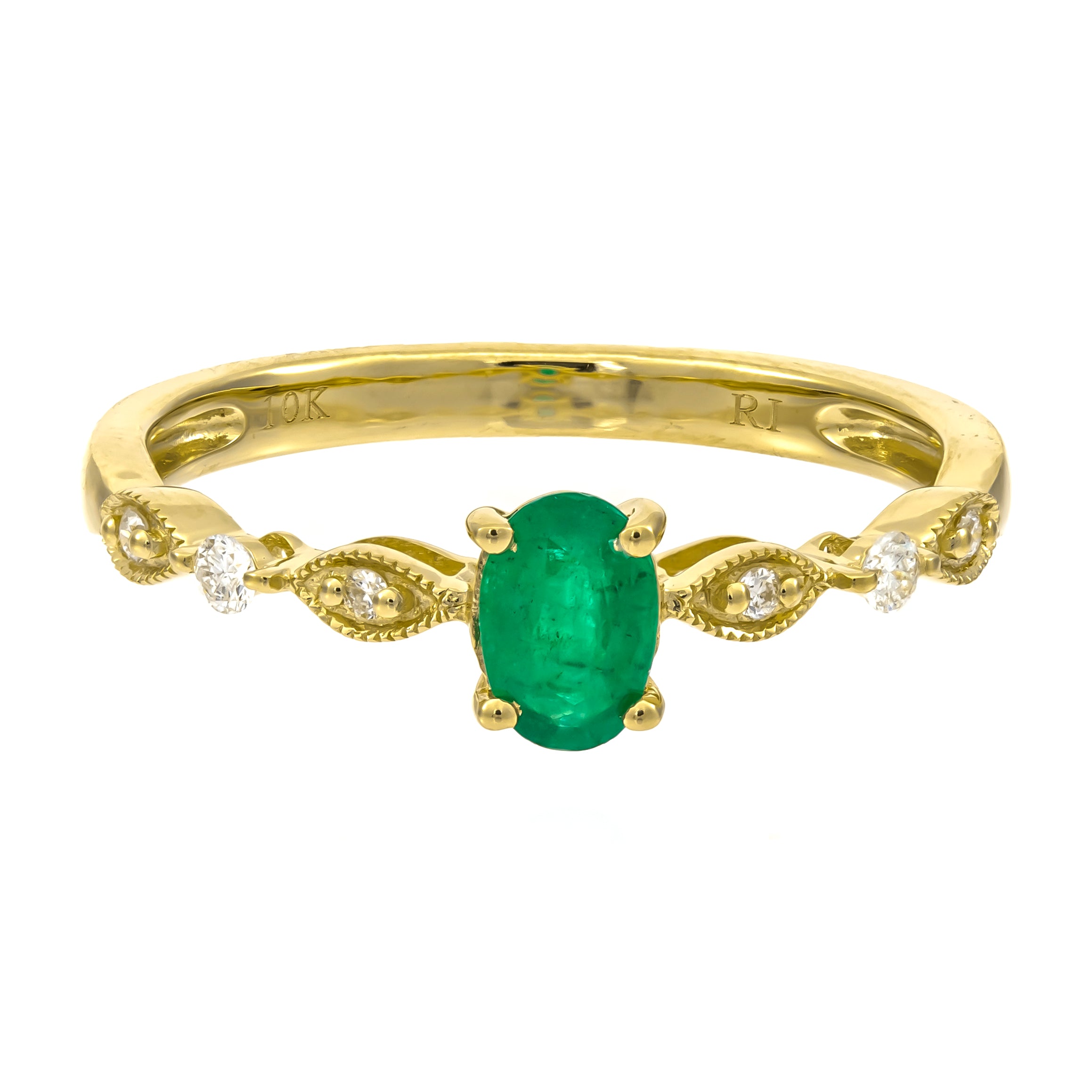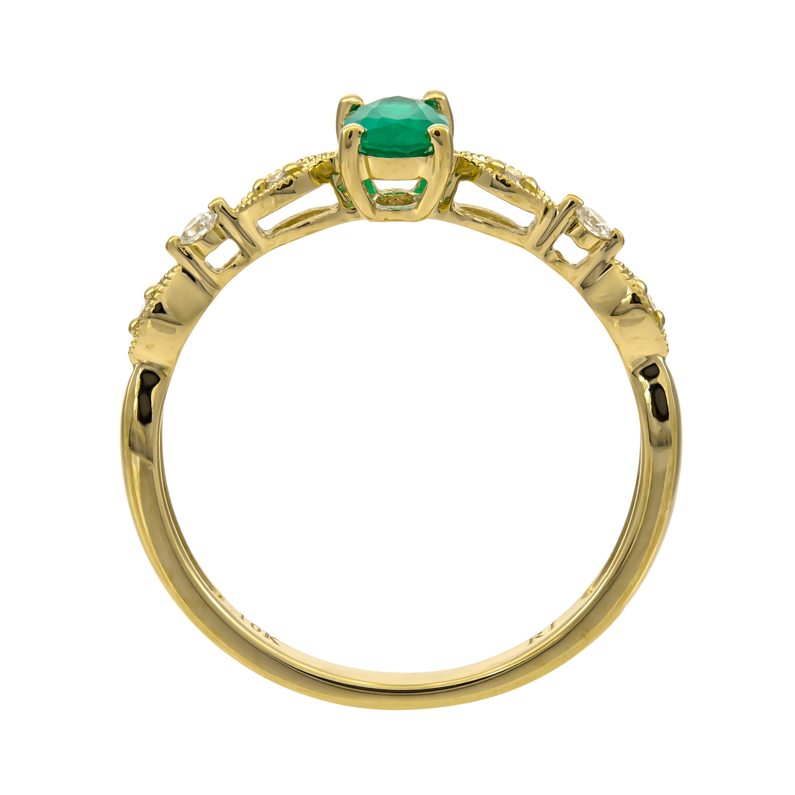 Stunning, timeless and classy eternity Unique Ring. Decorate yourself in luxury with this Gin & Grace Ring. The 10K Yellow Gold jewelry boasts Oval-Cut Prong Setting Natural Emerald (1 pc) 0.41 Carat, along with Natural Round cut white Diamond (6 Pcs) 0.07 Carat, accent stones for a lovely design. This Ring is weight 1.54 grams. Crafted with 10K Yellow Gold, this delicate Ring is polished to a high finish shine.