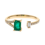 Bold yet refined, the Verdant Crest ring showcases a captivating 4x6mm (0.57ct) emerald-cut emerald at its heart—an emblem of vitality and elegance. Surrounding it, 21 sparkling white diamonds and a single baguette-cut diamond (totaling 0.151ct) add radiant brilliance and dimension. Set in rich 14K yellow gold, this ring features a modern cuff-style band that brings architectural sophistication to a timeless gemstone. Whether worn alone or stacked, it’s a striking piece that merges regal charm with contemporary design.