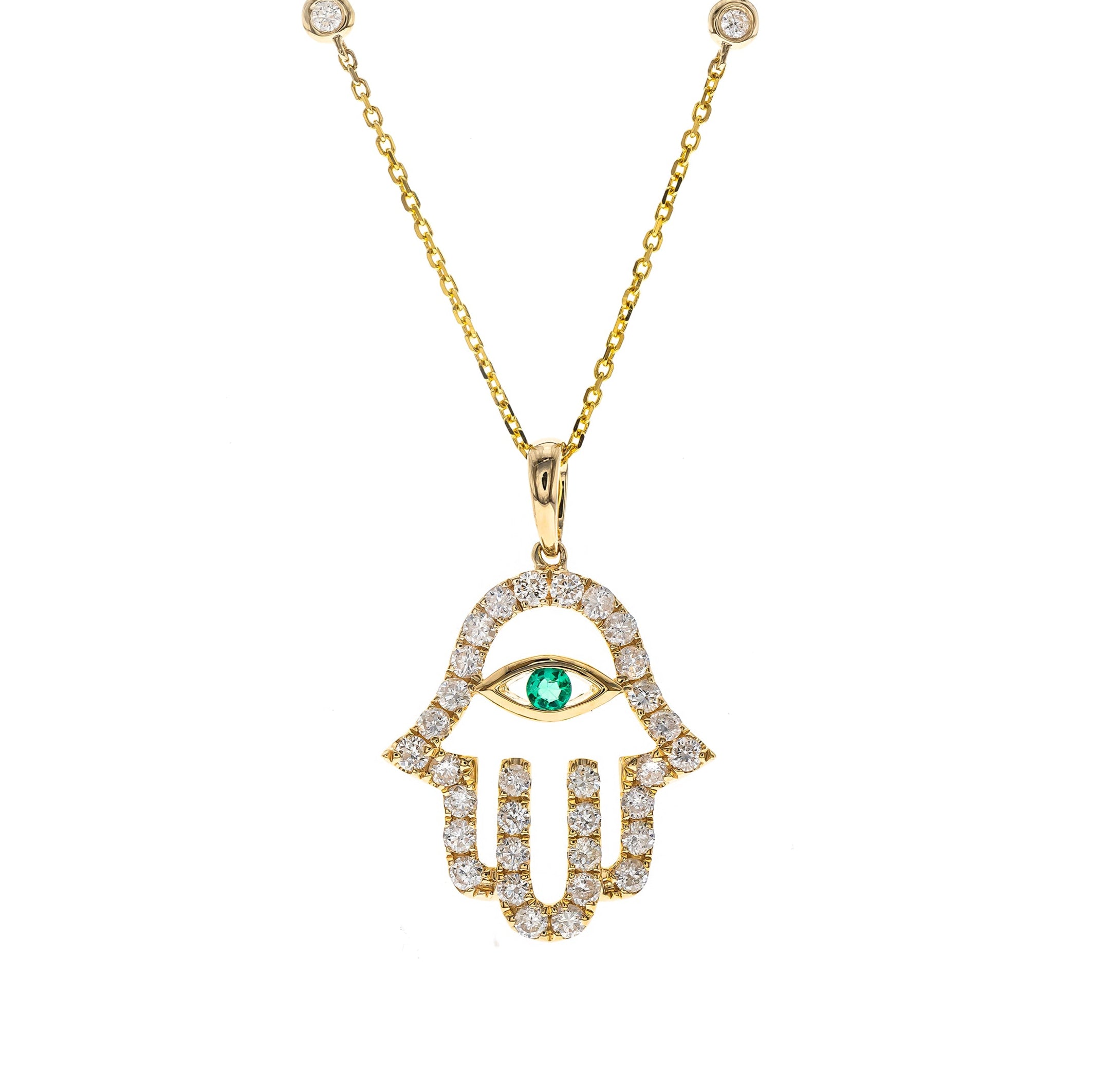 Decorate yourself in elegance with this Pendant is crafted from 14-karat yellow Gold by Gin & Grace. This Pendant is made up of Zambian Emerald round-cut (1 pcs) 0.08 carat and Round-cut Diamond (32 Pcs) 0.84 carat. This Pendant is weight 2.80 grams. This delicate Pendant is polished to a high finish shine.