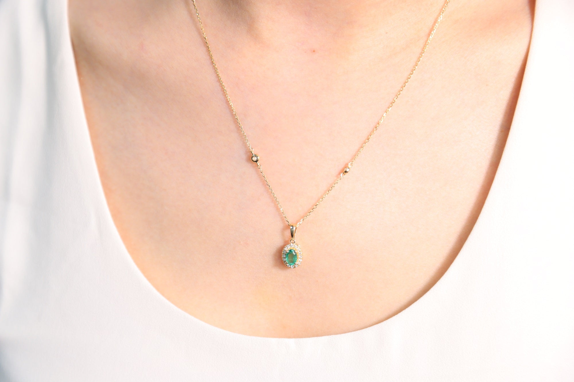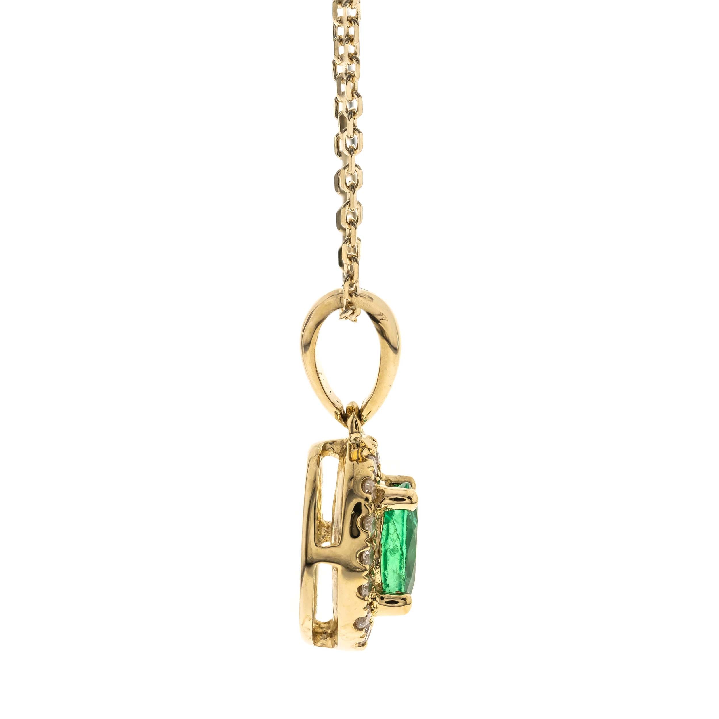 Decorate yourself in elegance with this Pendant is crafted from 10-karat Yellow Gold by Gin & Grace Pendant. This Pendant is made up of 4*6 mm Oval-cut Prong setting Zambian Emerald (1 Pcs) 0.41 Carat and Round-Cut White Diamond (16 Pcs) 0.09 Carat. This Pendant is weight 1.21 grams. The gorgeous Pendant hangs from an 18-inch wheat chain. This delicate Pendant is polished to a high finish shine.