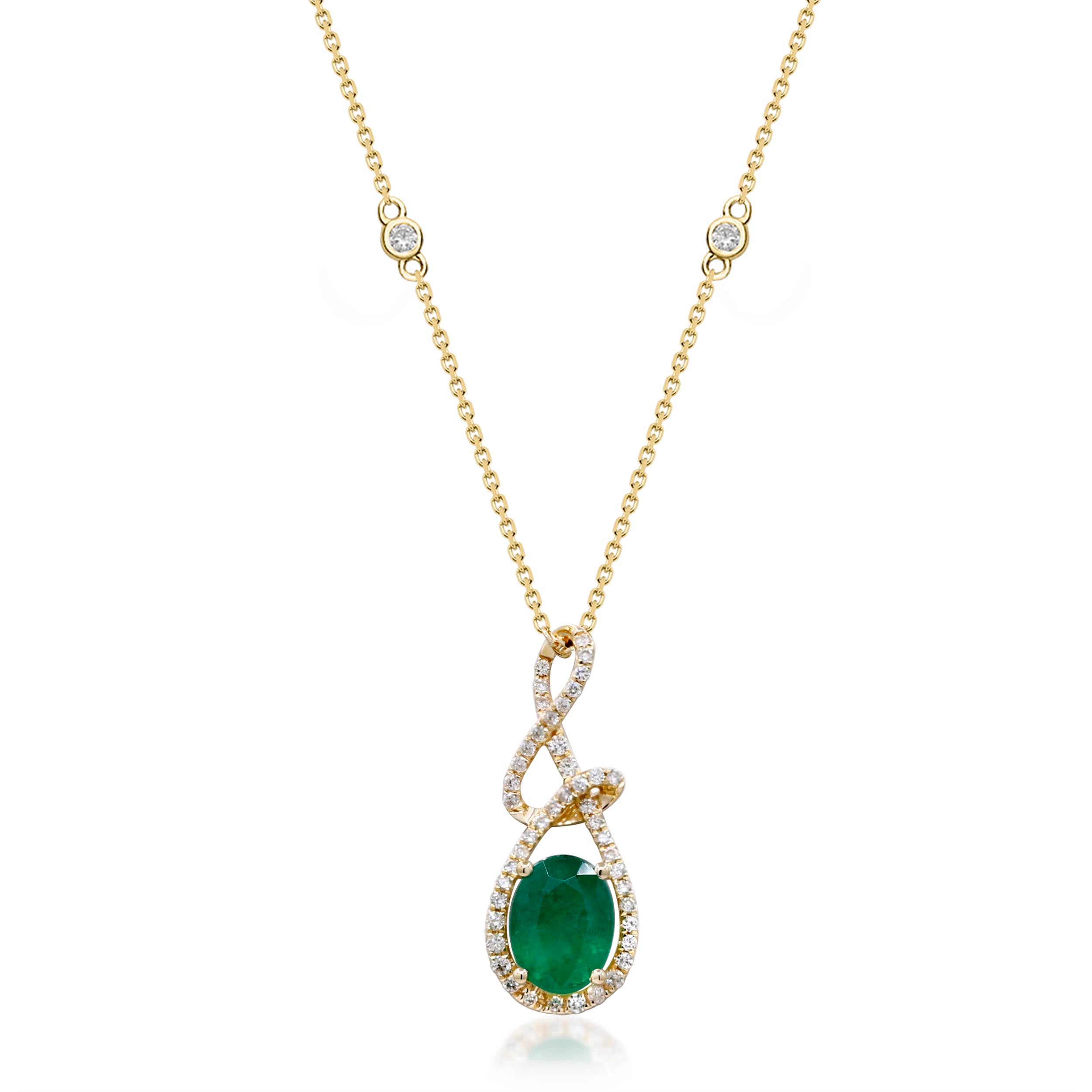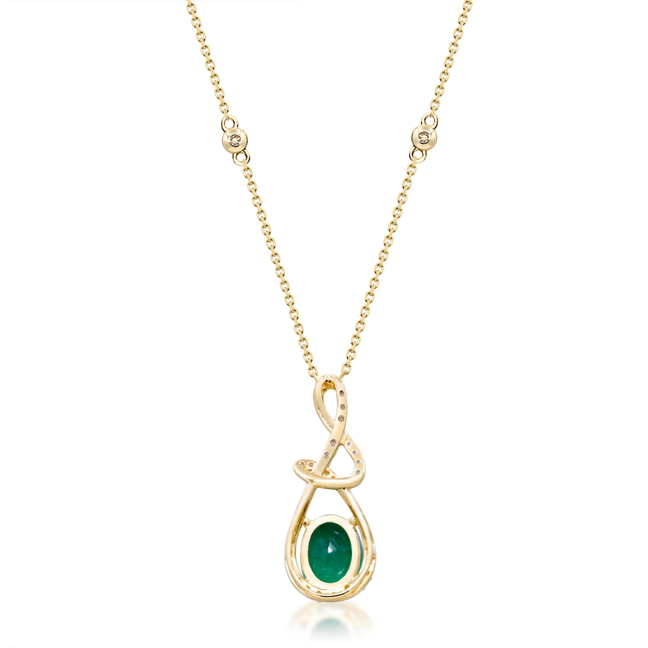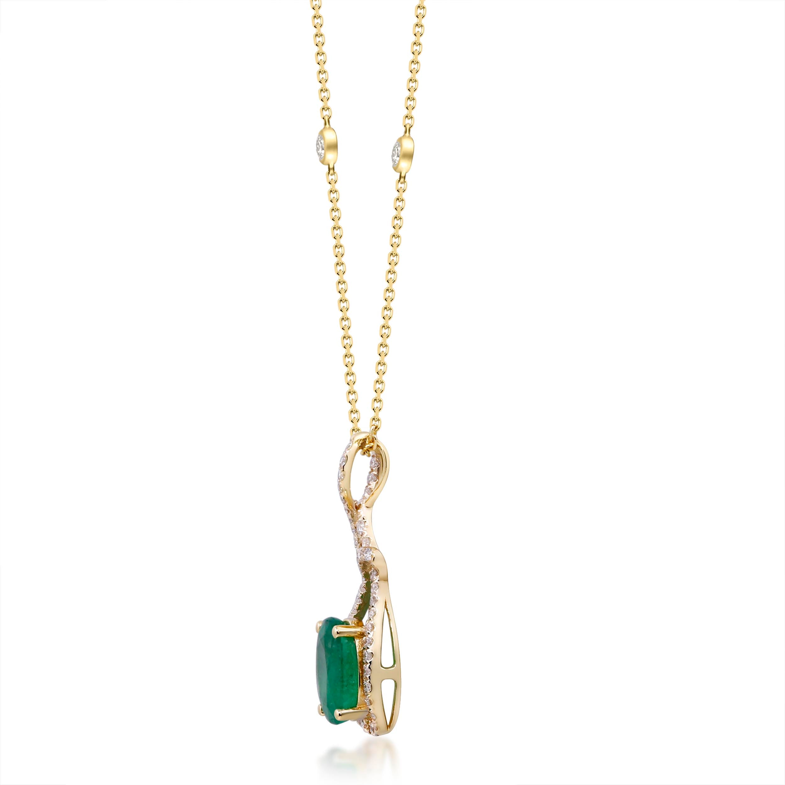 Decorate yourself in elegance with this Pendant is crafted from 14-karat Yellow Gold by Gin & Grace Pendant. This Pendant is made up of 6*8 mm Oval-Cut Prong setting Natural Zambian Emerald (1 Pcs) 0.17 Carat and Round-Cut Prong setting Natural White Diamond (48 Pcs) 0.26 Carat. This Pendant is weight 2.50 grams. The gorgeous Pendant hangs from a 18-inch wheat chain. This delicate Pendant is polished to a high finish shineÂ