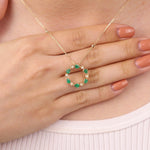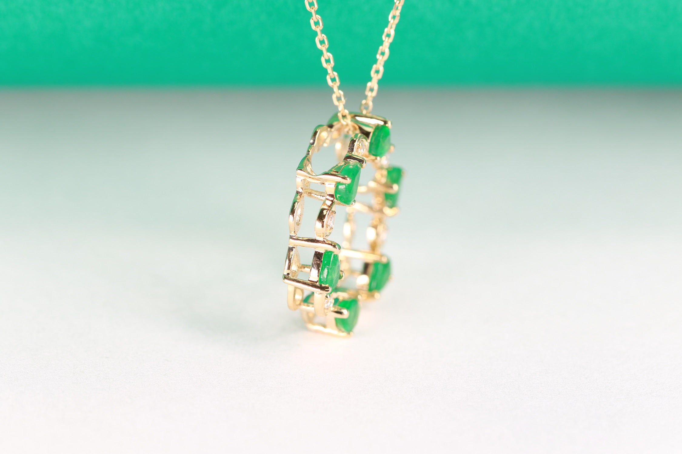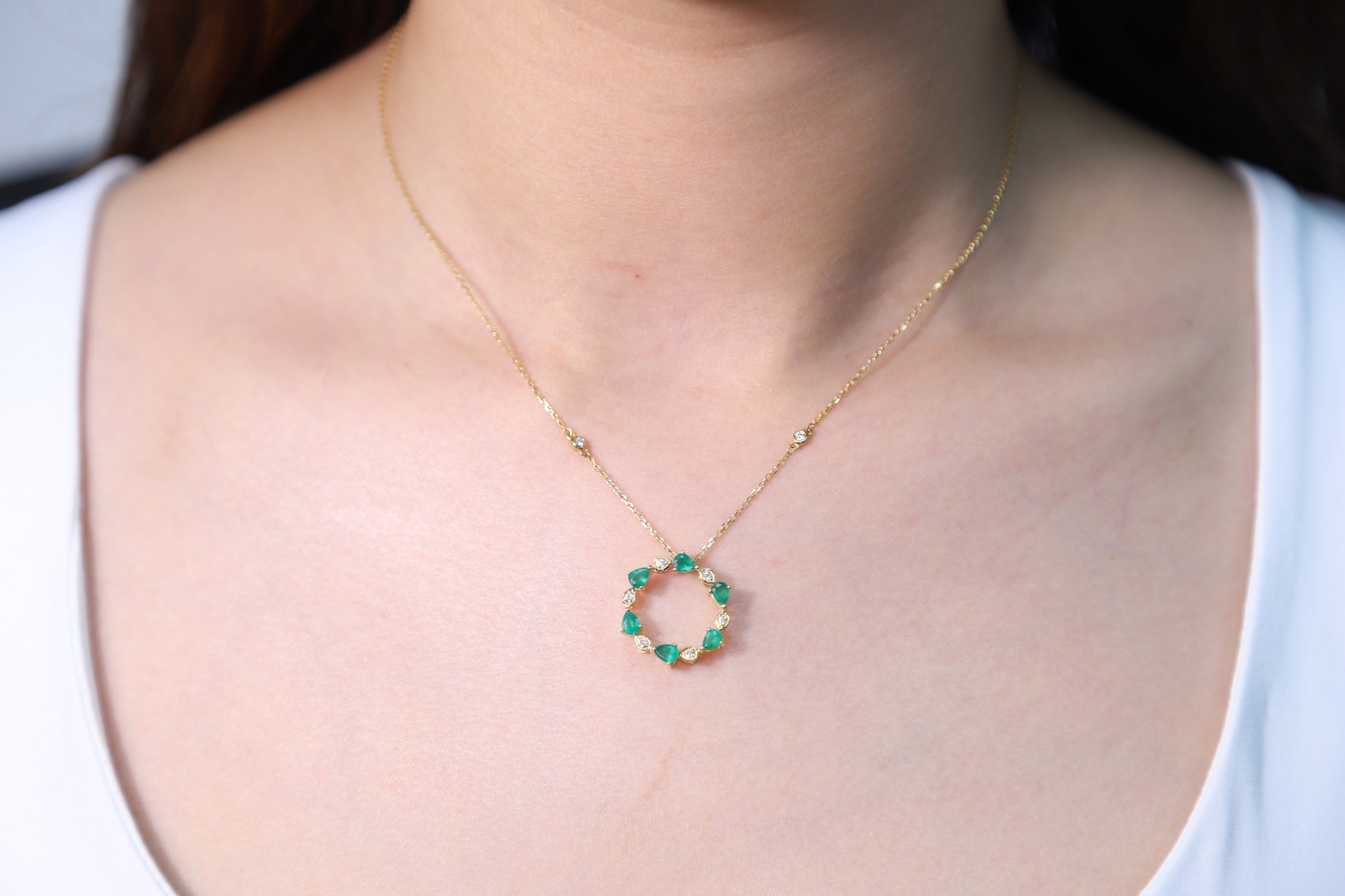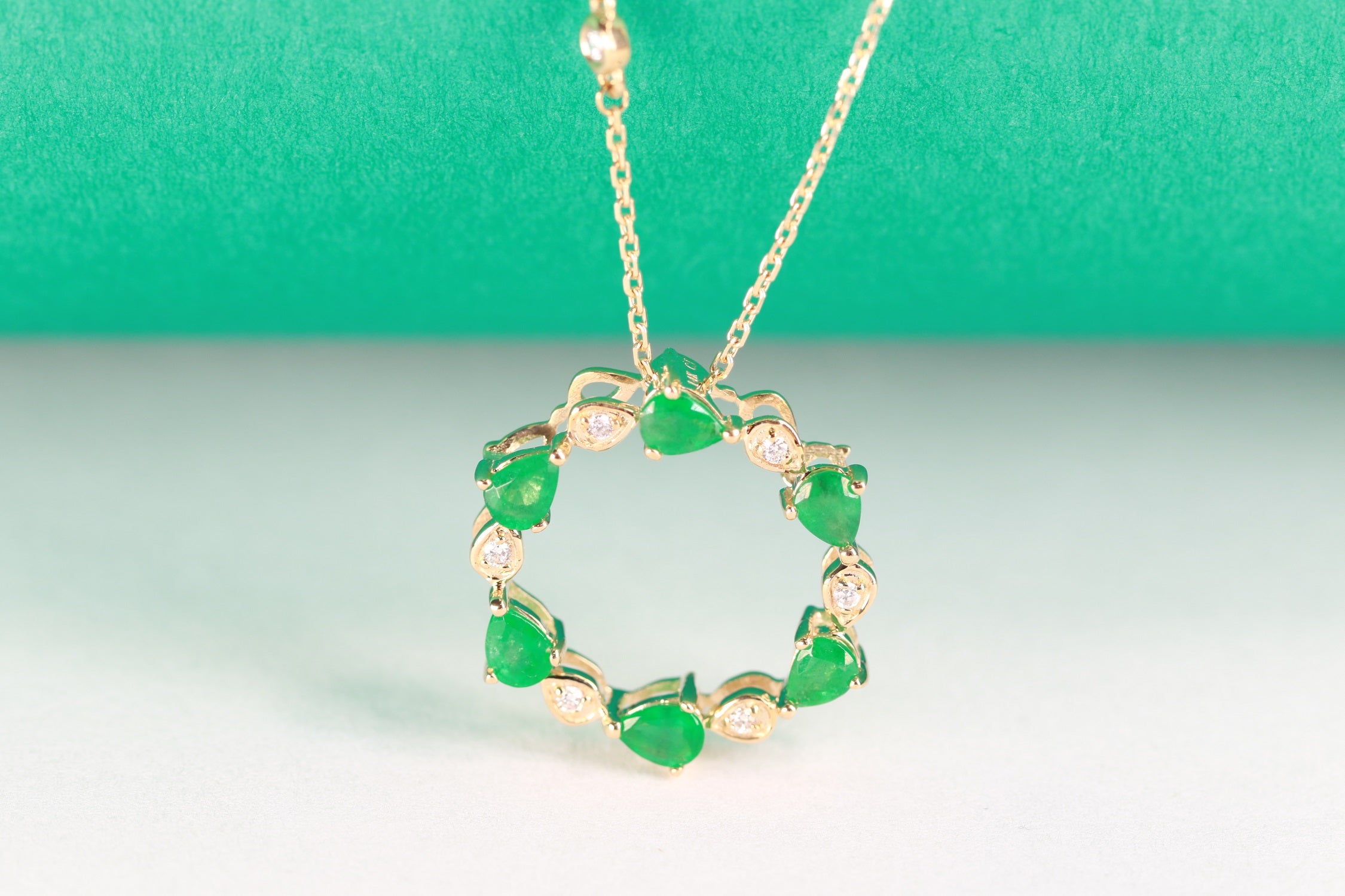 Decorate yourself in elegance with this Pendant is crafted from 10-karat Yellow Gold by Gin & Grace Pendant. This Pendant is made up of 3*4 Pear-cut Prong setting Emerald (6 Pcs) 0.81 Carat and Round-Cut White Diamond (8 Pcs) 0.08 Carat. This Pendant is weight 2.86 grams. The gorgeous Pendant hangs from a 18-inch wheat chain. This delicate Pendant is polished to a high finish shine.