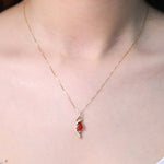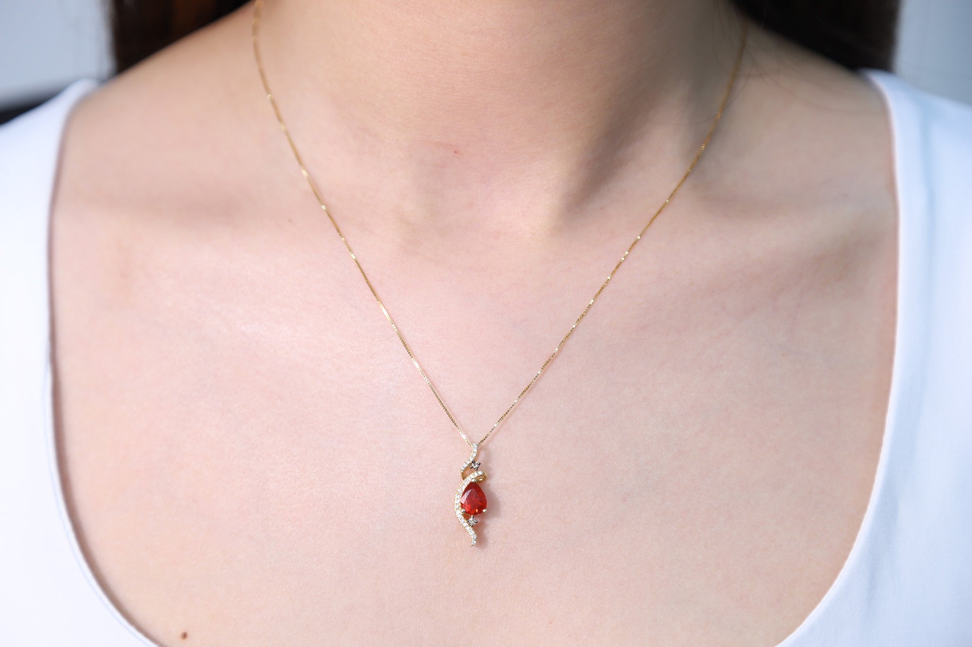 Decorate yourself in elegance with this Pendant is crafted from 14-karat Yellow Gold by Gin & Grace Pendant. This Pendant is made up of 6*8 mm Pear-Cut Prong setting Natural Mexican Fire Opal (1 Pcs) 0.06 Carat and Round-Cut Prong setting Natural White Diamond (27 Pcs) 0.12 Carat. This Pendant is weight 1.12 grams. The gorgeous Pendant hangs from a 18-inch wheat chain. This delicate Pendant is polished to a high finish shine.
