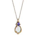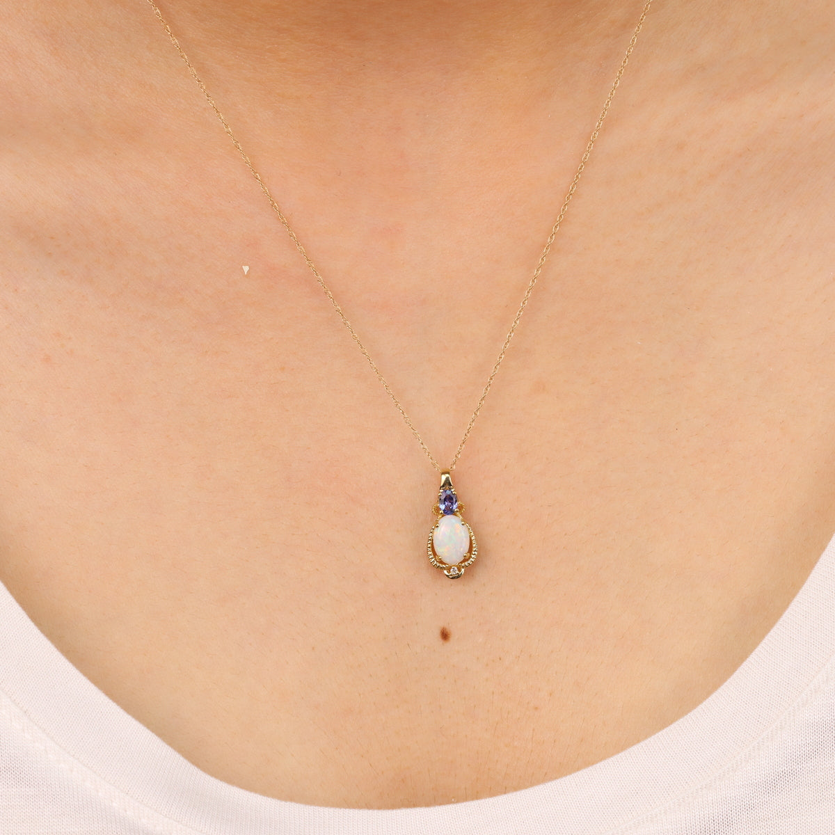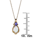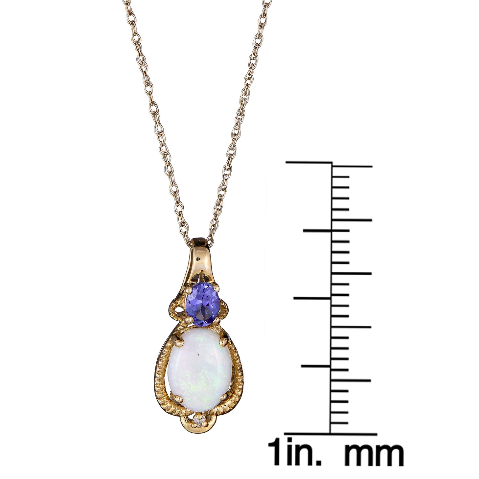 Decorate yourself in elegance with this Pendant is crafted from 10-karat Yellow Gold by The Gin & Grace Pendant. This Pendant is made up of 6X8 mm Oval-cut Prong setting Natural African Opal (1 Pcs) 0.65 Carat and 3X4 mm Oval-cut Prong setting Genuine Tanzanian Tanzanite(1 Pcs) 0.21 Carat and Round-Cut Prong setting Natural White Diamond (1 Pcs) 0.01 Carat. This Pendant is weight 0.87 grams. The gorgeous Pendant hangs from an 18-inch wheat chain. This delicate Pendant is polished to a high finish shine.