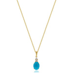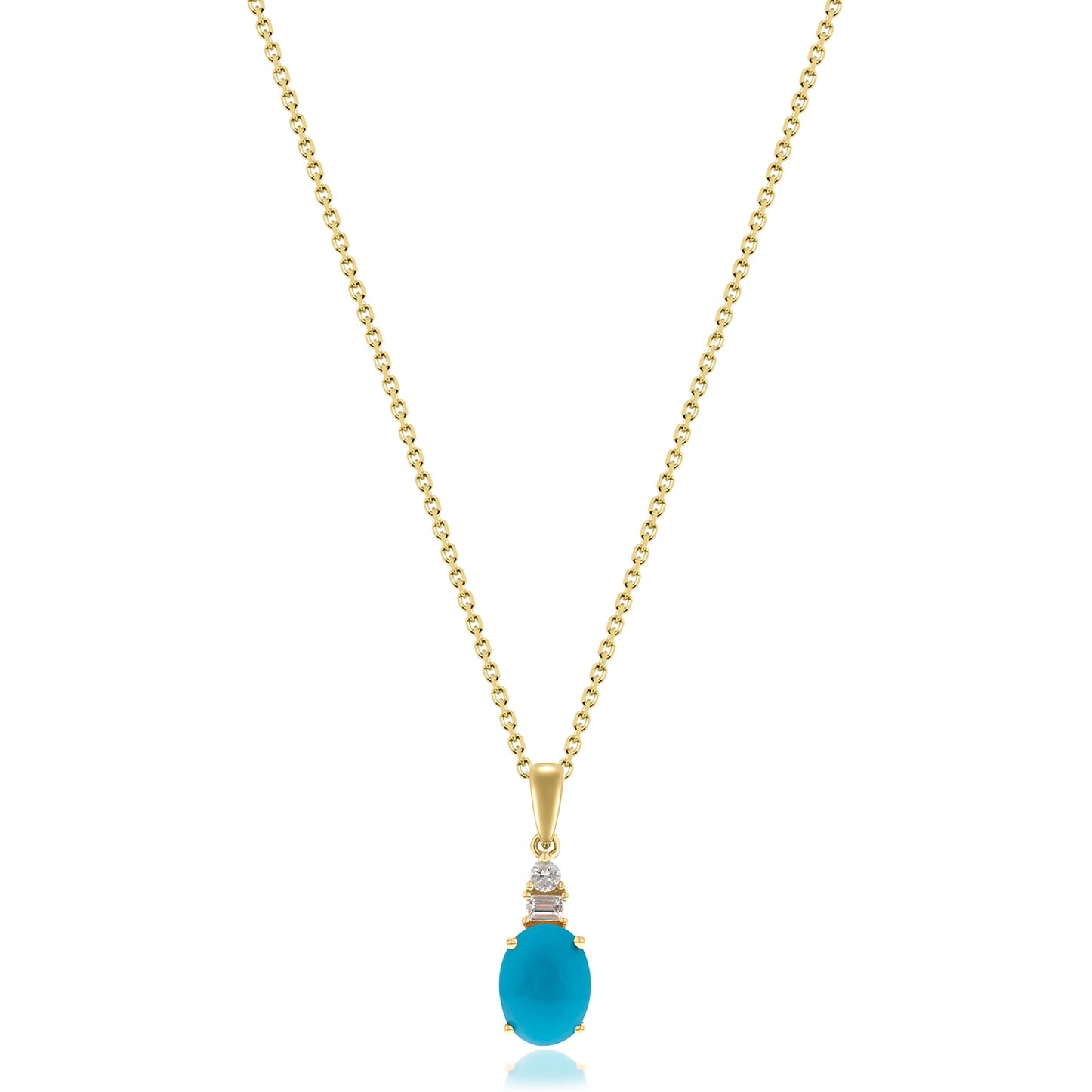 Decorate yourself in elegance with this Pendant is crafted from 10-karat Yellow Gold by Gin & Grace Pendant. This Pendant is made up of Oval-Cab Prong setting Genuine Arizona Turquoise (1 Pcs) 1.31 Carat and Round-Cut Prong setting Natural White Diamond (2 Pcs) 0.08 Carat. This Pendant is weight 0.74 grams. The gorgeous Pendant hangs from a 18-inch wheat chain. This delicate Pendant is polished to a high finish shine.