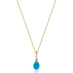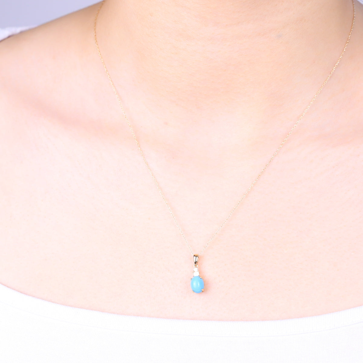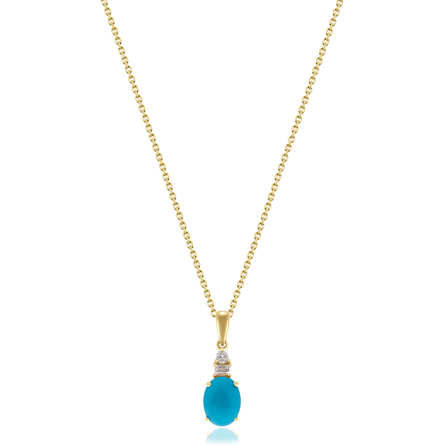 Decorate yourself in elegance with this Pendant is crafted from 10-karat Yellow Gold by Gin & Grace Pendant. This Pendant is made up of Oval-Cab Prong setting Genuine Arizona Turquoise (1 Pcs) 1.31 Carat and Round-Cut Prong setting Natural White Diamond (2 Pcs) 0.08 Carat. This Pendant is weight 0.74 grams. The gorgeous Pendant hangs from a 18-inch wheat chain. This delicate Pendant is polished to a high finish shine.