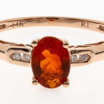 Three rich red oval-cut Fire Opal are accented with round-cut diamond accents, making up this elegant ring by Gin & Grace. This jewelry is crafted of 14K rose gold with a high-polished finish. Gemstone colors: Orange Gemstone shapes: Oval One prong-set oval-cut Mexican Fire Opal measures 5 mm wide x 7 mm long Gemstone weight: 0.57 carat Total gemstone weight: 0.57 carat Diamonds: 4 Diamond cut: Round-cut Diamond measurements: Each measures 1 mm Diamond weight: 0.03 carat Color: G-H Clarity: I1-I2 Setting: Pave-set Metal: 14K rose gold Finish: High polish Metal weight: 1.78 grams Ring setting dimensions: 17 mm wide x 22 mm long x 4 mm deep Band dimensions: 2 mm wide