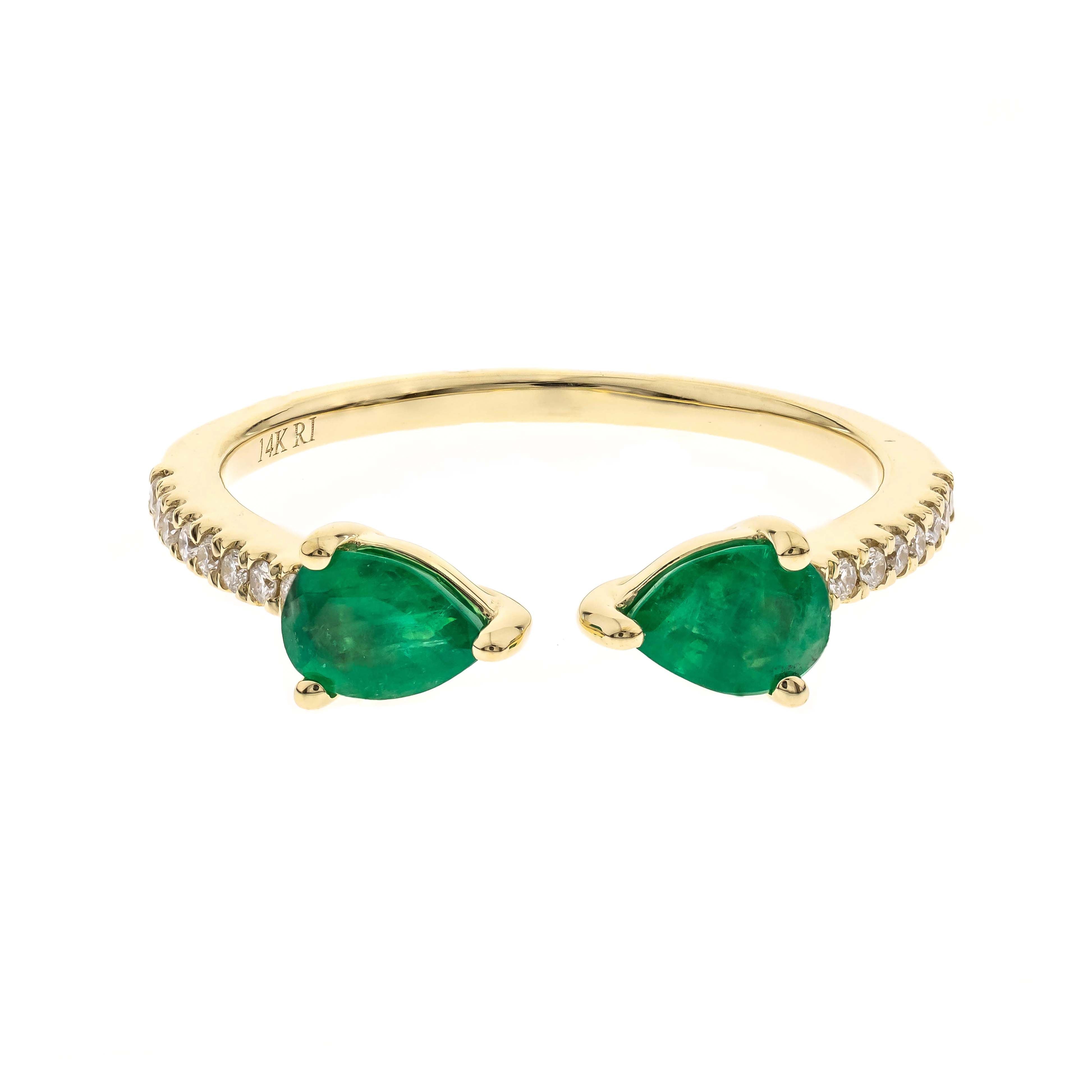 Stunning, timeless and classy eternity Unique Ring. Decorate yourself in luxury with this Gin & Grace Ring. The 14k Yellow Gold jewelry boasts Pear-Cut Prong Setting Natural Emerald (2 pcs) 0.64 Carat, along with Natural Round cut white Diamond (16 Pcs) 0.08 Carat, accent stones for a lovely design. This Ring is weight 2.0 grams. Crafted with 14k Yellow Gold, this delicate Ring is polished to a high finish shine.