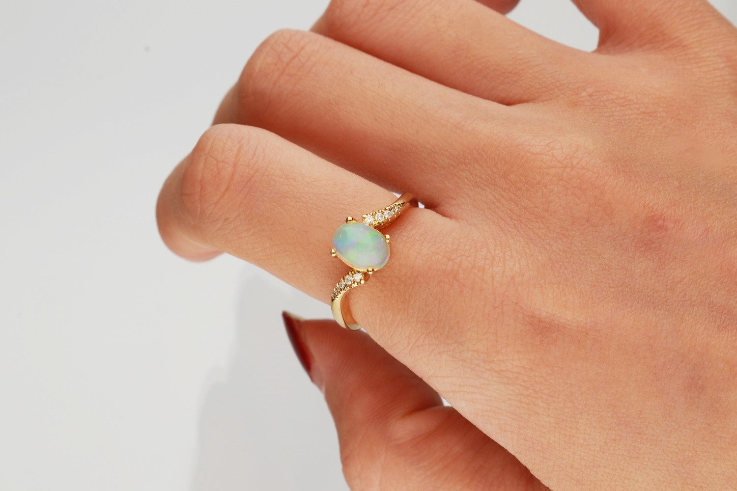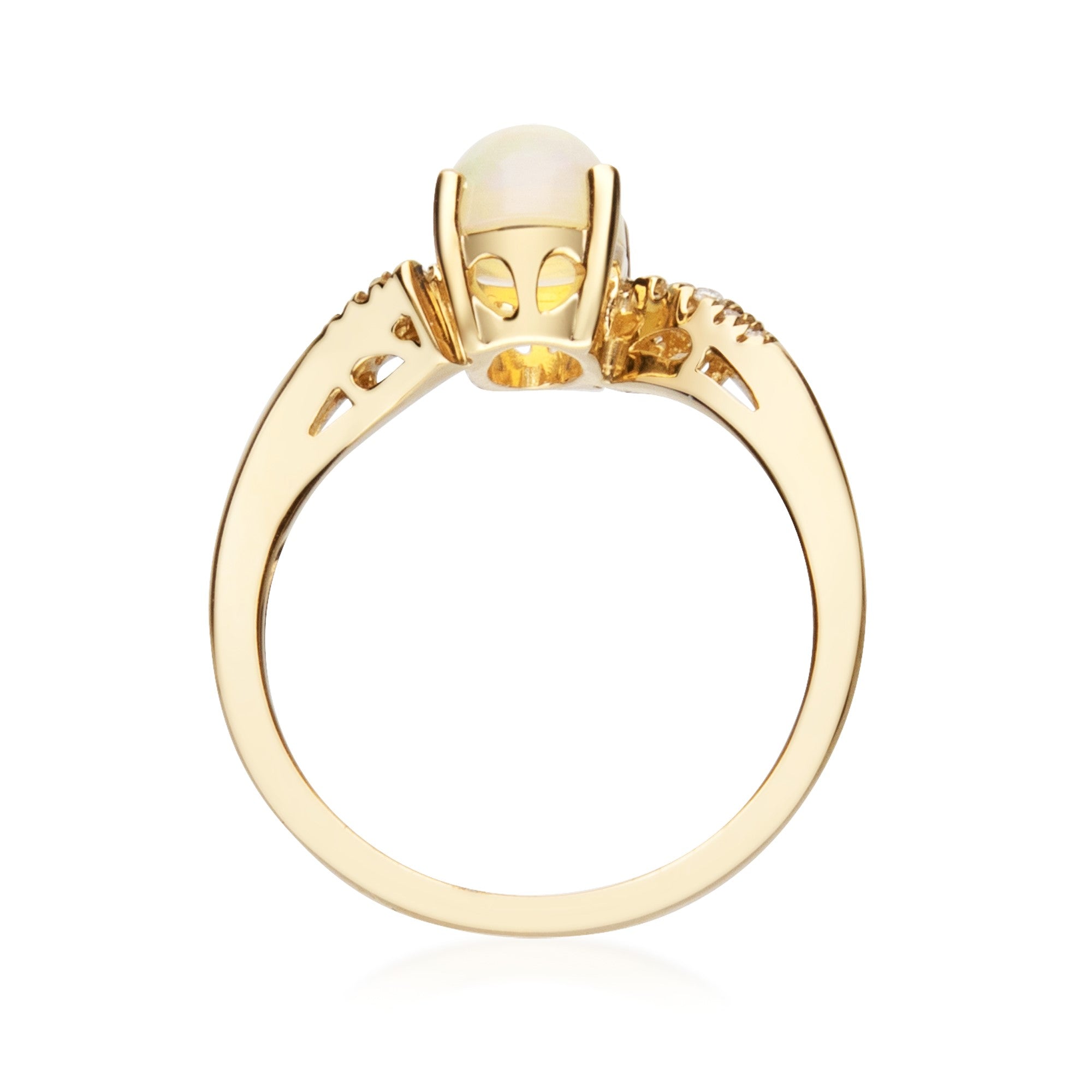 Stunning, timeless and classy eternity Engagement ring. Decorate yourself in luxury with this Gin & Grace ring. This ring is made up of Oval-Cut Prong Setting Natural African Opal (1 pcs) 0.90 Carat and Round-Cut Prong Setting Diamond (10 pcs) 0.05 Carat accent stones for a lovely design. This ring is weight 2.46 grams. The ring is crafted of shining 10-karat Yellow Gold and is completed by a highly polished finish.