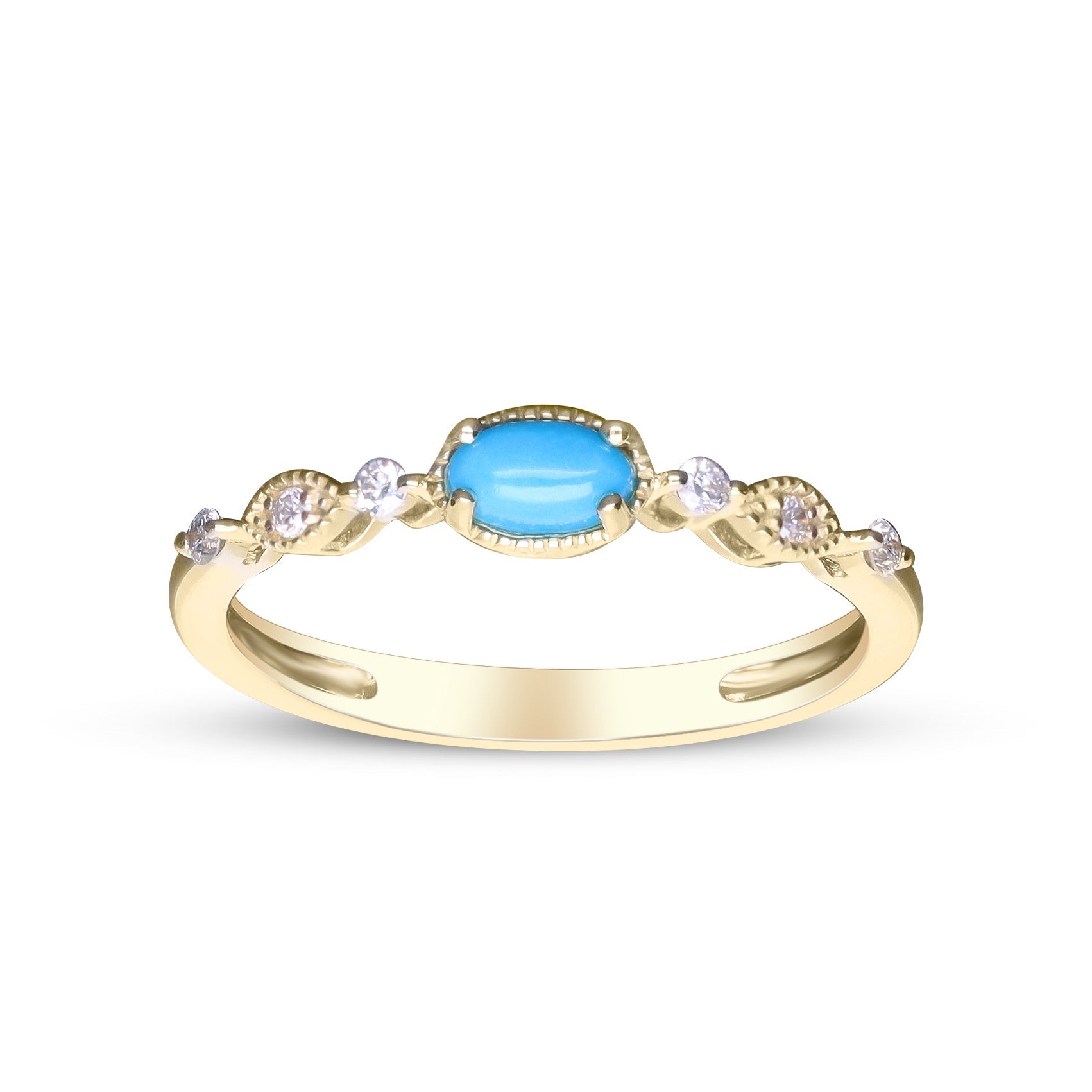 Decorate yourself in elegance with this Ring is crafted from 10-karat yellow gold 3X5 Oval-Cut Arizona Turquoise (1 pcs) 0.23 carat and Round-cut White Diamond (6 Pcs) 0.09 Carat. This Ring is weight 1.39 grams. This delicate Ring is polished to a high finish shine.