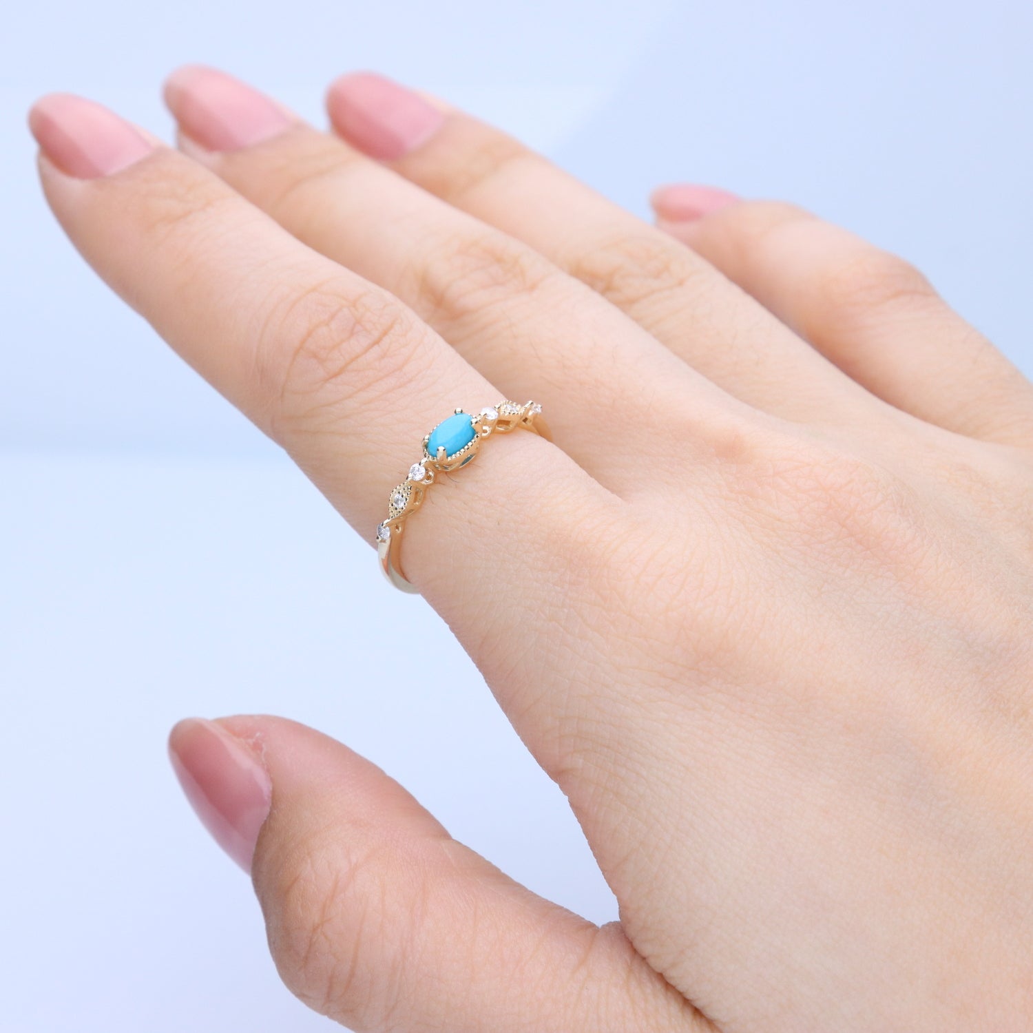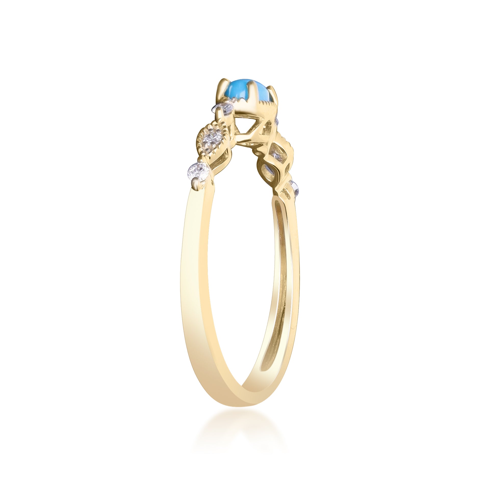 Decorate yourself in elegance with this Ring is crafted from 10-karat yellow gold 3X5 Oval-Cut Arizona Turquoise (1 pcs) 0.23 carat and Round-cut White Diamond (6 Pcs) 0.09 Carat. This Ring is weight 1.39 grams. This delicate Ring is polished to a high finish shine.