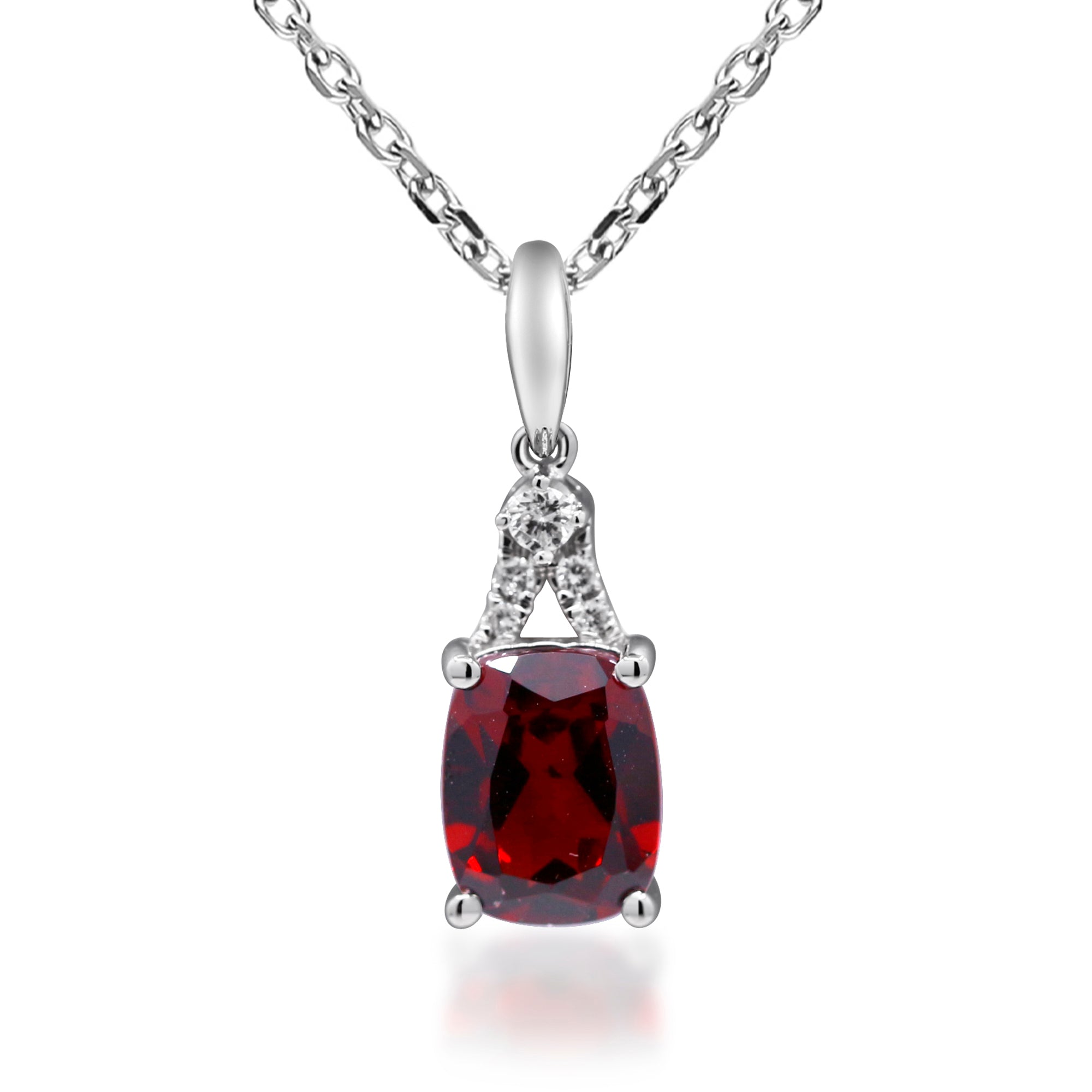 Decorate yourself in elegance with this Pendant crafted from 10-karat White Gold by Gin & Grace. This Pendant is made up of 8x6 mm Cushion-Cut Garnet (1 pcs) 1.81 carat and Round-cut White Diamond (5 Pcs) 0.05 Carat. This Pendant weighs 1.93 grams. This delicate Pendant is polished to a high finish shine.