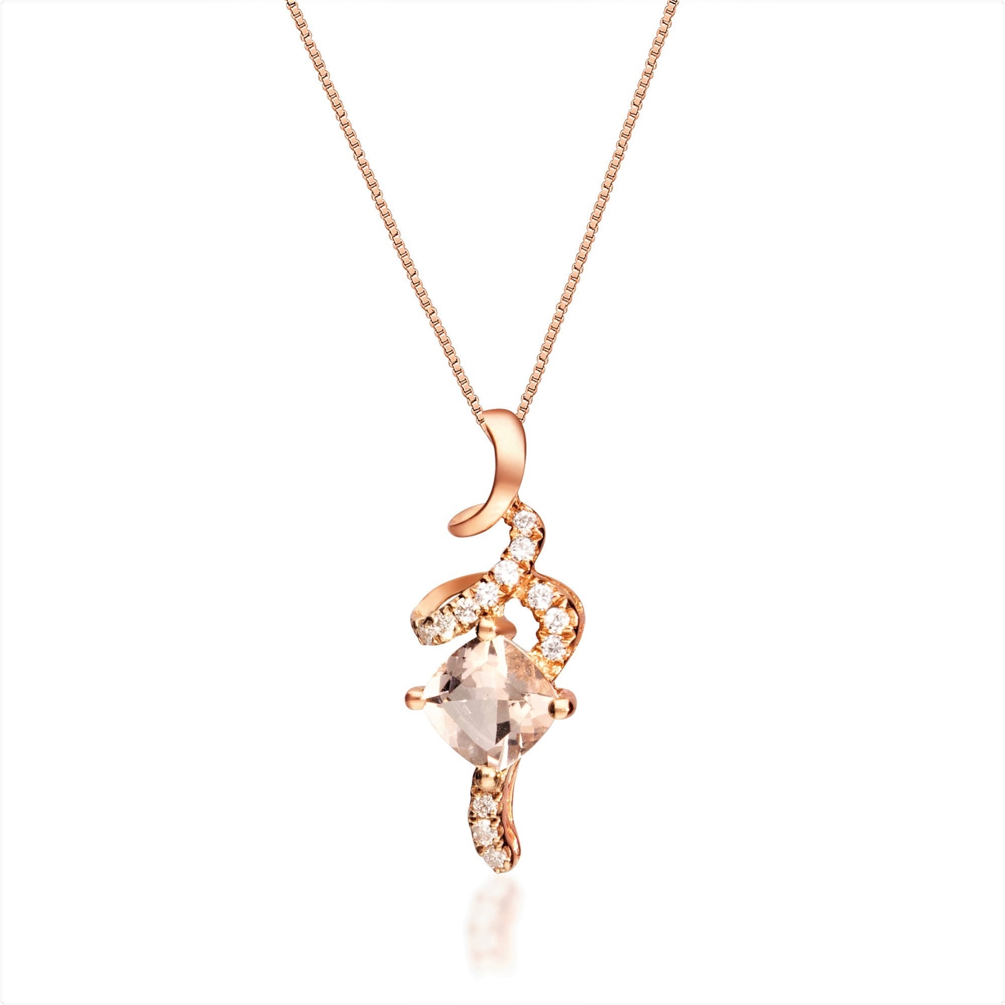 Decorate yourself in elegance with this Pendant is crafted from 10-karat Rose Gold by Gin & Grace Pendant. This Pendant is made up of 6MM Cushion-Cut Prong setting Genuine Madagascar Morganite (1 Pcs) 0.87 Carat and Round-Cut Prong setting Natural White Diamond (13 Pcs) 0.12 Carat. This Pendant is weight 0.75 grams. The gorgeous Pendant hangs from an 18-inch wheat chain. This delicate Pendant is polished to a high finish shine.