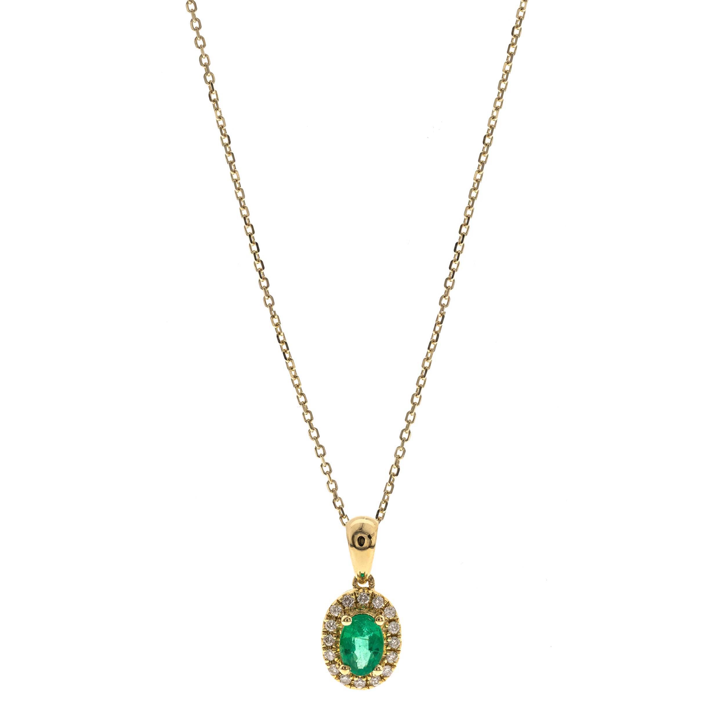 Decorate yourself in elegance with this Pendant is crafted from 10-karat Yellow Gold by Gin & Grace Pendant. This Pendant is made up of 4*6 mm Oval-cut Prong setting Zambian Emerald (1 Pcs) 0.41 Carat and Round-Cut White Diamond (16 Pcs) 0.09 Carat. This Pendant is weight 1.21 grams. The gorgeous Pendant hangs from an 18-inch wheat chain. This delicate Pendant is polished to a high finish shine.