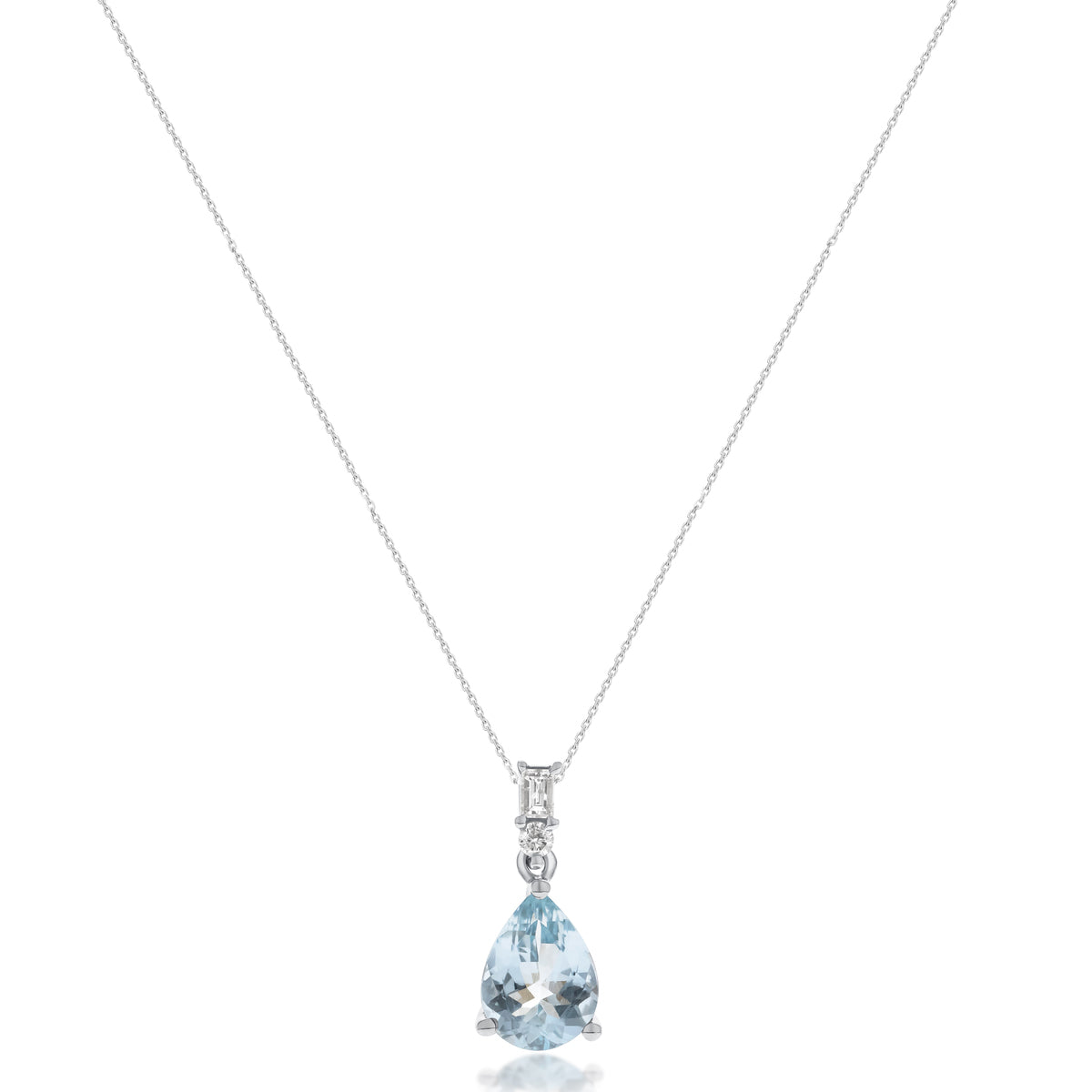 Decorate yourself in elegance with this Pendant is crafted from 10-karat White Gold by Gin & Grace. This Pendant is made up of 7.0 mm Pear-cut Brazilian Aquamarine (1 pcs) 0.98 carat and Round-cut White Diamond (2 Pcs) 0.06 Carat. This Pendant is weight 0.47 grams. This delicate Pendant is polished to a high finish shine.