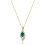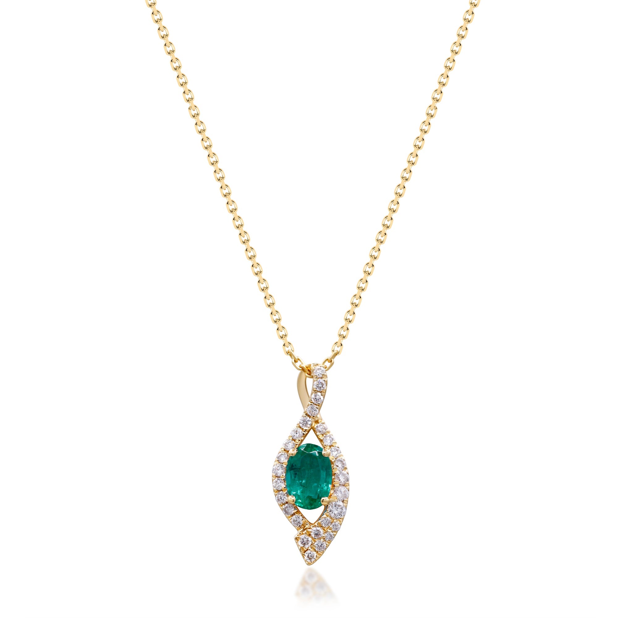 Decorate yourself in elegance with this Pendant is crafted from 10-karat Yellow Gold by Gin & Grace. This Pendant is made up of Oval-Cut Emerald (1 pcs) 0.42 carat and Round-cut White Diamond (27 Pcs) 0.21 Carat. This Pendant is weight 0.56 grams. This delicate Pendant is polished to a high finish shine.