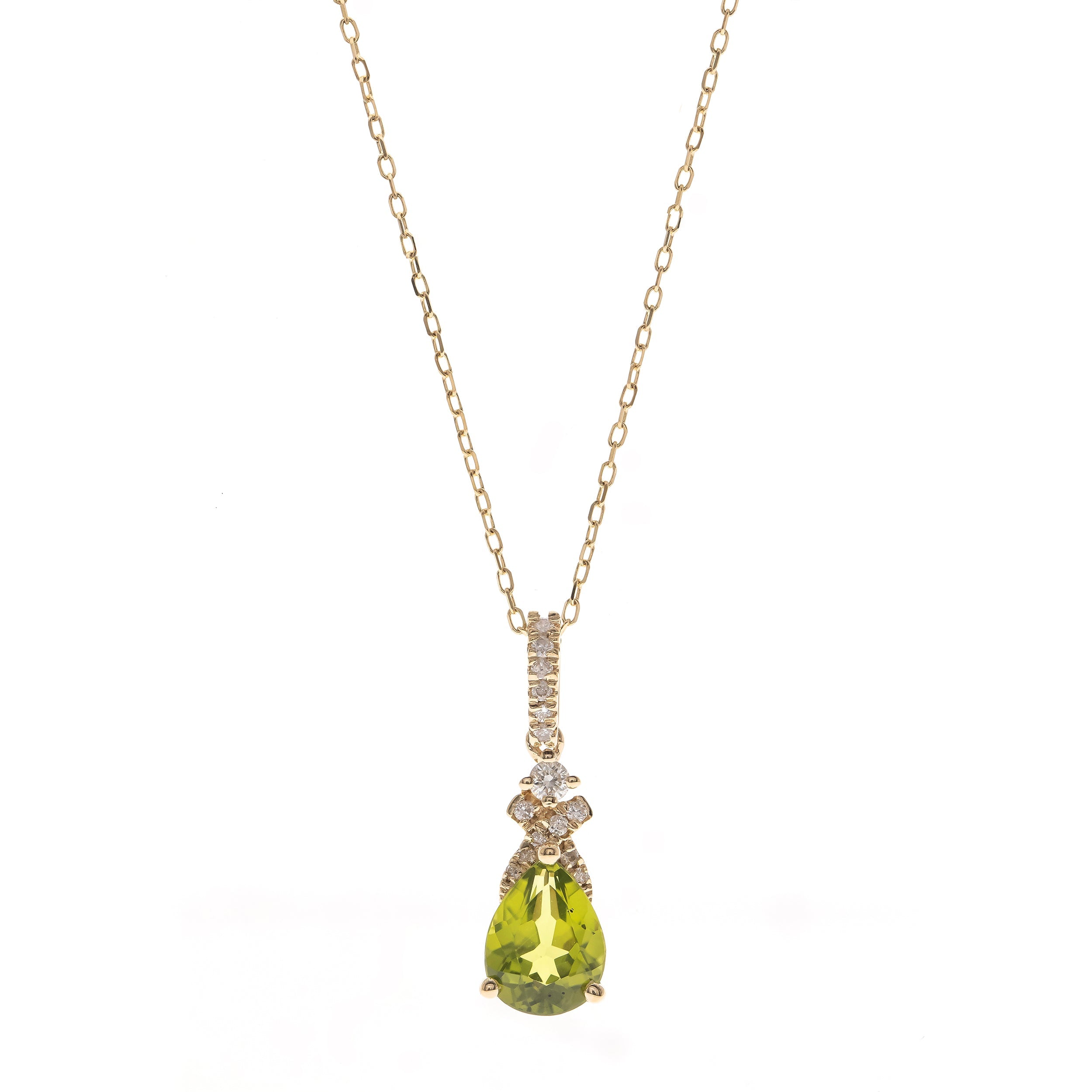 Decorate yourself in elegance with this Pendant is crafted from 14-karat Yellow Gold by Gin & Grace. This Pendant is made up of 6*8 mm Pear-Cut Manchurian Peridot (1 pcs) 1.31 carat and Round-cut White Diamond (17 Pcs) 0.12 Carat. This Pendant is weight 1.76 grams. This delicate Pendant is polished to a high finish shine.