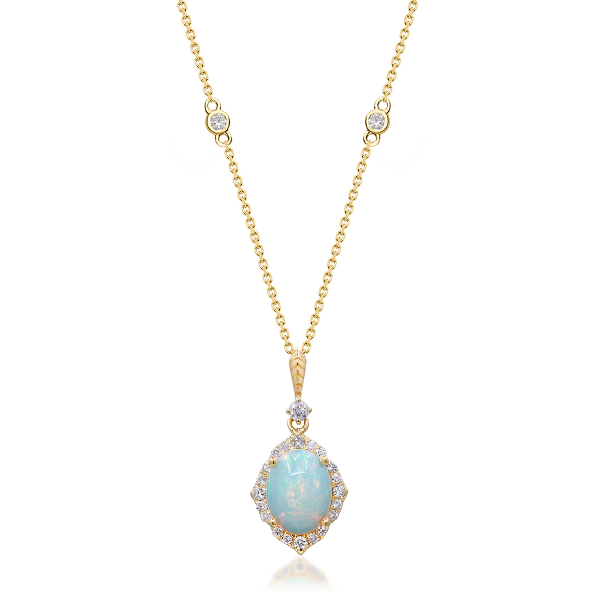 Stunning, timeless and classy eternity Unique Pendant. Decorate yourself in luxury with this Gin & Grace Pendant. The 10K Yellow Gold jewelry boasts Oval-Cut Prong Setting Natural Opal (1 pc) 1.28 Carat, along with Natural Round cut white Diamond (17 Pcs) 0.15 Carat, accent stones for a lovely design. This Pendant is weight 1.22 grams. Crafted with 10K Yellow Gold, this delicate Pendant is polished to a high finish shine.