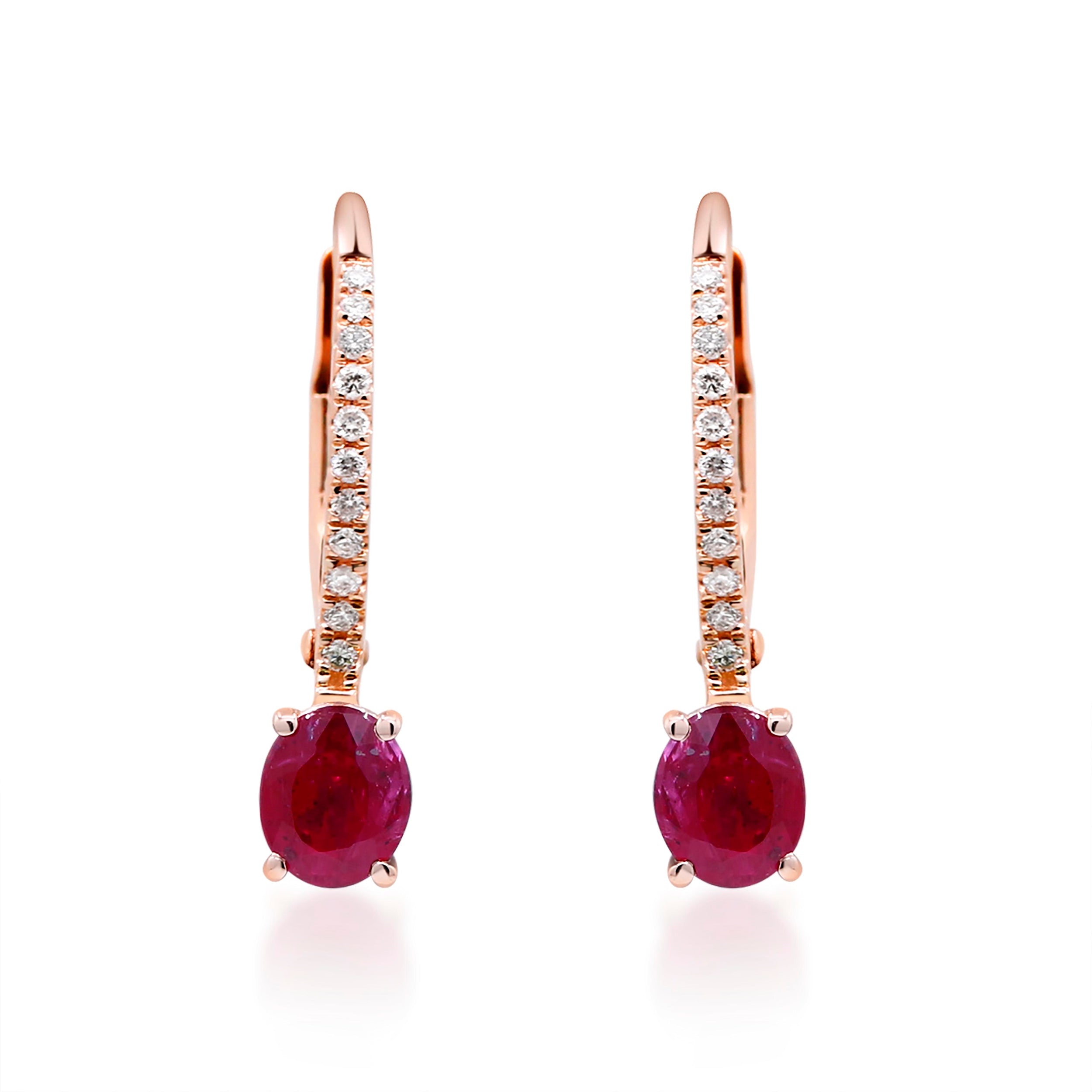 Stunning, timeless and classy eternity Unique Earring. Decorate yourself in luxury with this Gin & Grace Earring. The 10K Rose Gold jewelry boasts Oval-Cut Prong Setting Mozambique Ruby (2 pcs) 0.87 Carat, along with Natural Round cut white Diamond (14 Pcs) 0.05 Carat, accent stones for a lovely design. This Earring is weight 1.07 grams. Crafted with 10K Rose Gold, this delicate Earring is polished to a high finish shine.