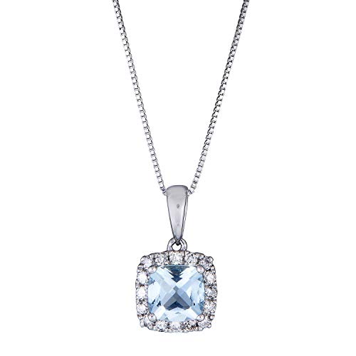 Decorate yourself in elegance with this Pendant is crafted from 10-karat White Gold by The Loop Club Pendant. This Pendant is made up of 6MM Cushion-Cut Prong setting Brazilian Aquamarine (1 Pcs) 0.93 Carat and Round-Cut Prong setting White Diamond (16 Pcs) 0.18 Carat. This Pendant is weight 2.12Â grams. The gorgeous Pendant hangs from a 18-inch wheat chain. This delicate Pendant is polished to a high finish shine.