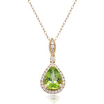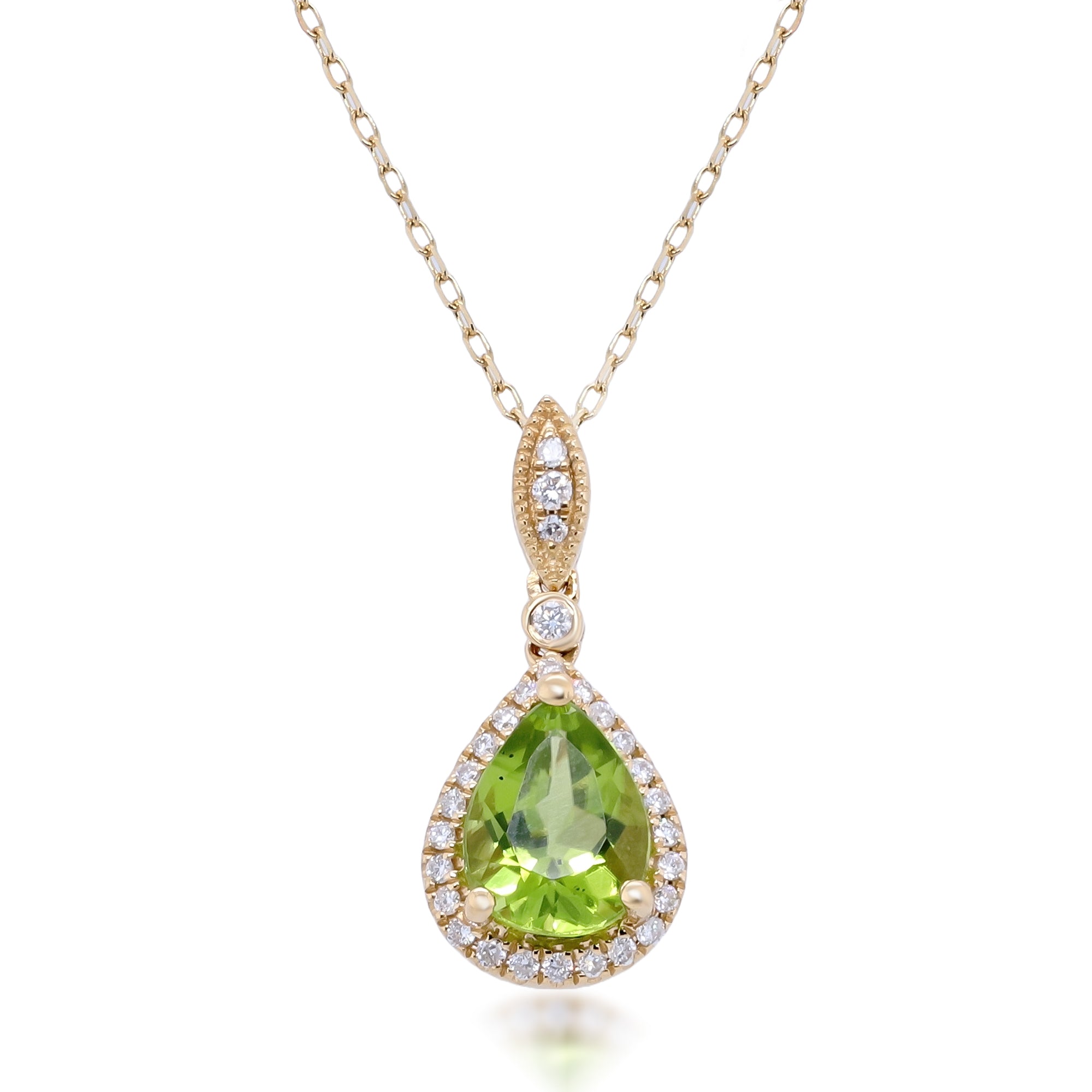 Decorate yourself in elegance with this Pendant is crafted from 14-karat Yellow Gold by Gin & Grace. This Pendant is made up of 6*8 mm Manchurian Peridot pear-cut (1 pcs) 1.29 carat and Round-cut Diamond (28 Pcs) 0.11 carat. This Pendant is weight 1.09 grams and 0.87 grams. This delicate Pendant is polished to a high finish shine.